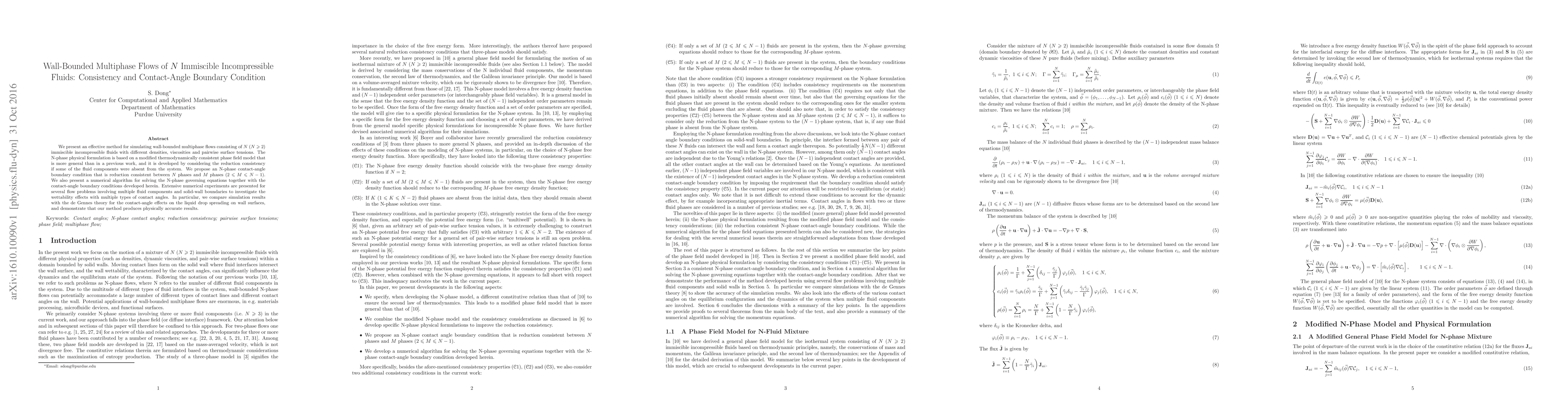 This paper proposes an effective method for simulating wall-bounded multiphase flows of $N$ immiscible incompressible fluids using a modified thermodynamically consistent phase field model. It introduces an N-phase contact-angle boundary condition, validated through numerical experiments and comparison with de Gennes theory.