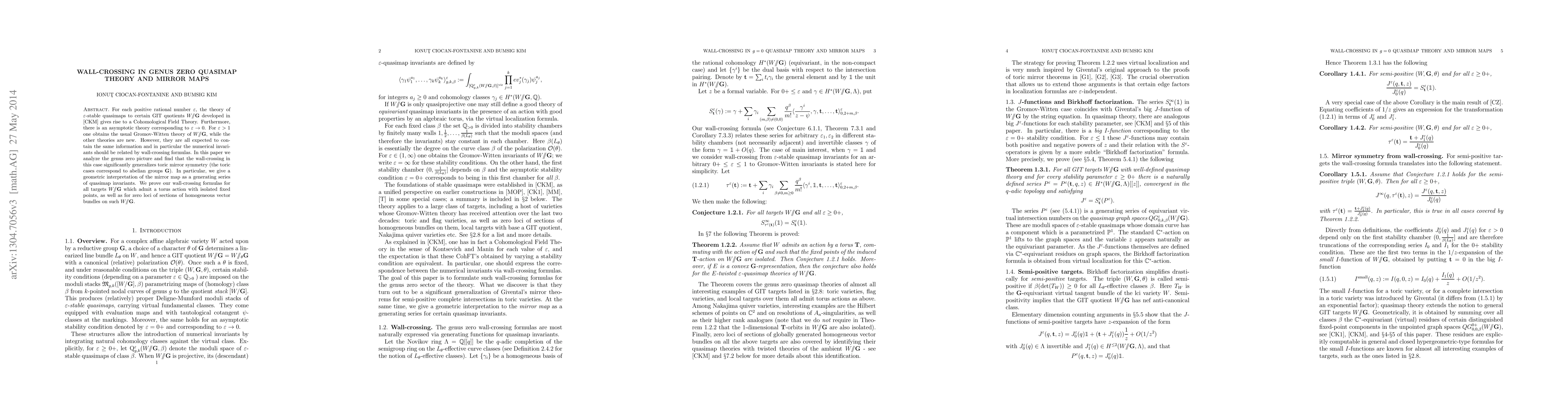 This paper investigates wall-crossing phenomena in genus zero quasimap theory for GIT quotients W//G, revealing how different theories relate through numerical invariants. It provides a geometric interpretation of the mirror map as a generating series and proves the wall-crossing formulas for targets with isolated fixed points under a torus action.