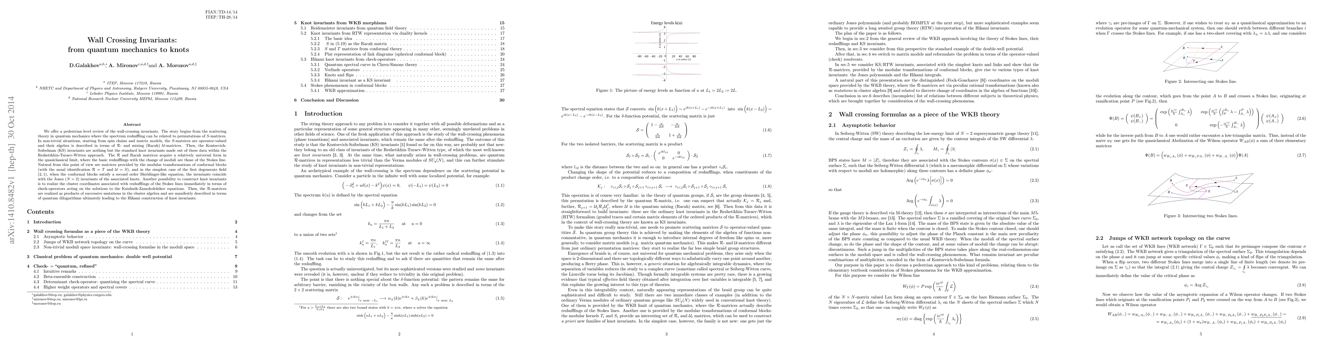 We offer a pedestrian level review of the wall-crossing invariants. The story begins from the scattering theory in quantum mechanics where the spectrum reshuffling can be related to permutations of S-matrices. In non-trivial situations, starting from spin chains and matrix models, the S-matrices are operator-valued and their algebra is described in terms of R- and mixing (Racah) U-matrices. Then, the Kontsevich-Soibelman invariants are nothing but the standard knot invariants made out of these data within the Reshetikhin-Turaev-Witten approach. The R- and Racah matrices acquire a relatively universal form in the quasiclassical limit, where the basic reshufflings with the change of moduli are those of the Stokes line. Natural from this point of view are matrices provided by the modular transformations of conformal blocks (with the usual identification R=T and U=S), and in the simplest case of the first degenerate field (2,1), when the conformal blocks satisfy a second order Shroedinger-like equation, the invariants coincide with the Jones (N=2) invariants of the associated knots. Another possibility to construct knot invariants is to realize the cluster coordinates associated with reshufflings of the Stokes lines immediately in terms of check-operators acting on the solutions to the Knizhnik-Zamolodchikov equations. Then, the R-matrices are realized as products of successive mutations in the cluster algebra and are manifestly described in terms of quantum dilogarithms ultimately leading to the Hikami construction of knot invariants.