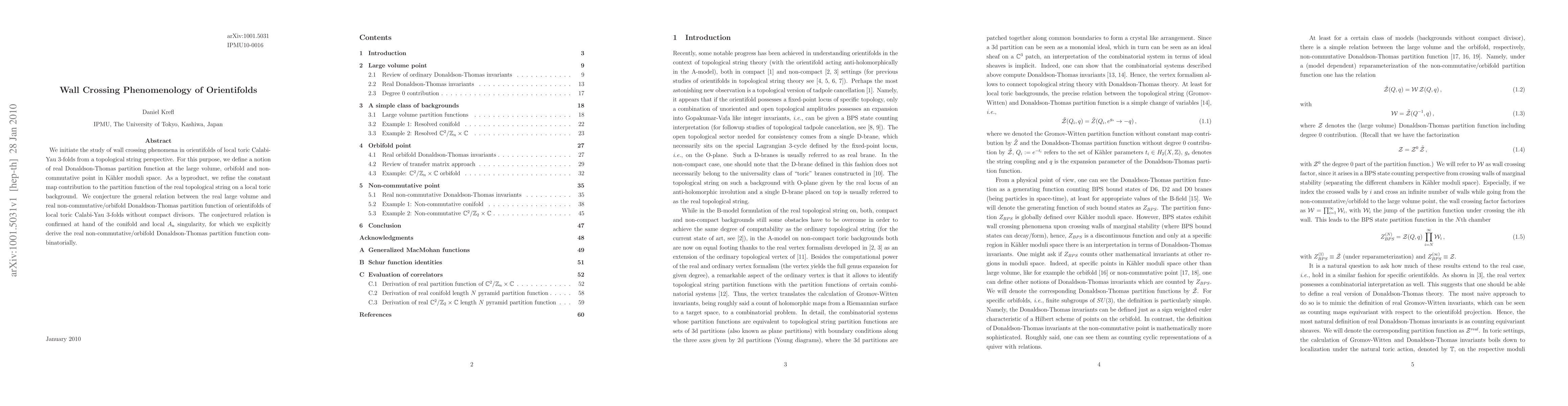 We initiate the study of wall crossing phenomena in orientifolds of local toric Calabi-Yau 3-folds from a topological string perspective. For this purpose, we define a notion of real Donaldson-Thomas partition function at the large volume, orbifold and non-commutative point in Kaehler moduli space. As a byproduct, we refine the constant map contribution to the partition function of the real topological string on a local toric background. We conjecture the general relation between the real large volume and real non-commutative/orbifold Donaldson-Thomas partition function of orientifolds of local toric Calabi-Yau 3-folds without compact divisors. The conjectured relation is confirmed at hand of the conifold and local A_n singularity, for which we explicitly derive the real non-commutative/orbifold Donaldson-Thomas partition function combinatorially.