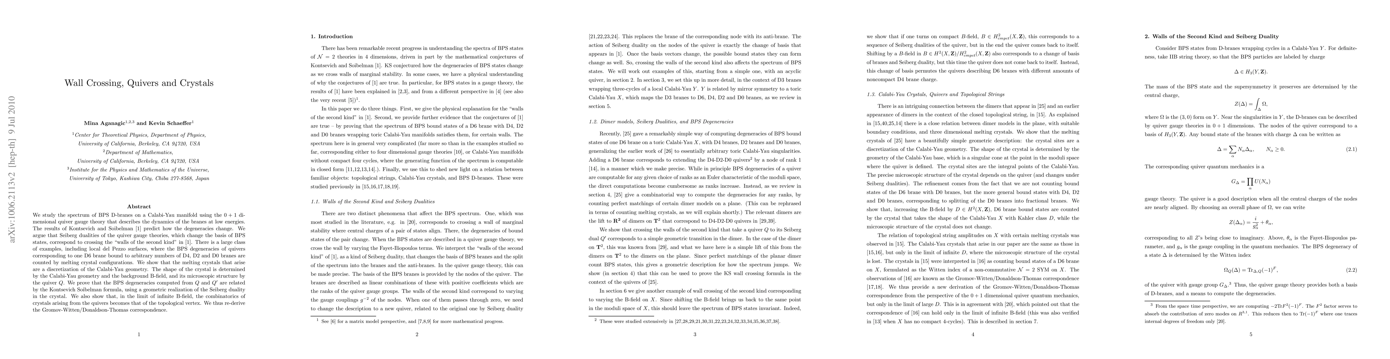 We study the spectrum of BPS D-branes on a Calabi-Yau manifold using the 0+1 dimensional quiver gauge theory that describes the dynamics of the branes at low energies. The results of Kontsevich and Soibelman predict how the degeneracies change. We argue that Seiberg dualities of the quiver gauge theories, which change the basis of BPS states, correspond to crossing the "walls of the second kind." There is a large class of examples, including local del Pezzo surfaces, where the BPS degeneracies of quivers corresponding to one D6 brane bound to arbitrary numbers of D4, D2 and D0 branes are counted by melting crystal configurations. We show that the melting crystals that arise are a discretization of the Calabi-Yau geometry. The shape of the crystal is determined by the Calabi-Yau geometry and the background B-field, and its microscopic structure by the quiver Q. We prove that the BPS degeneracies computed from Q and Q' are related by the Kontsevich Soibelman formula, using a geometric realization of the Seiberg duality in the crystal. We also show that, in the limit of infinite B-field, the combinatorics of crystals arising from the quivers becomes that of the topological vertex. We thus re-derive the Gromov-Witten/Donaldson-Thomas correspondence.