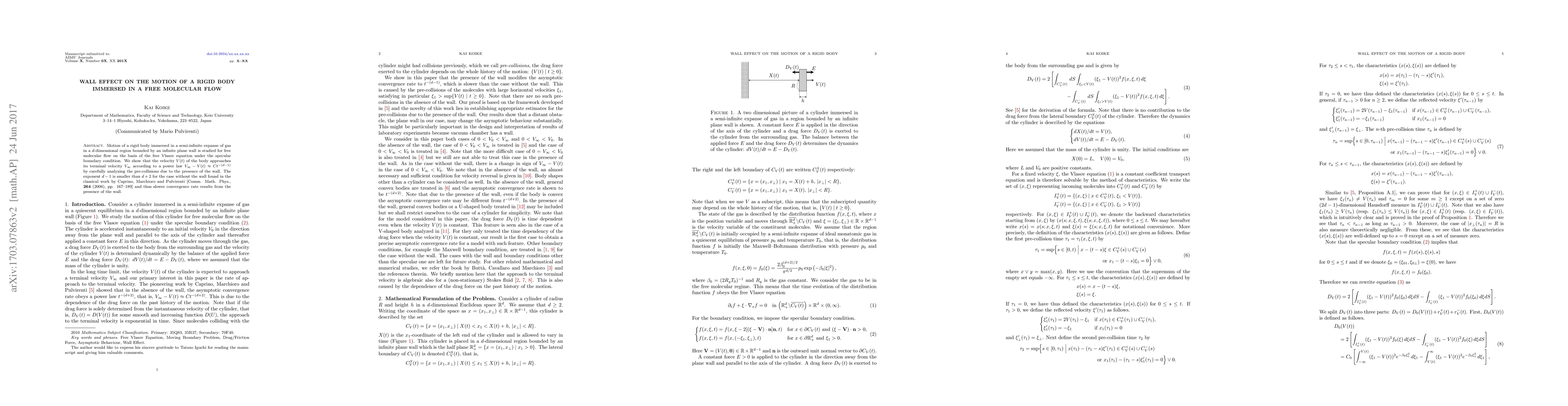 This research analyzes the motion of a rigid body in a free molecular flow within a d-dimensional space bounded by an infinite plane wall, using the free Vlasov equation and specular boundary conditions. It demonstrates that the body's velocity converges to its terminal velocity following a power law, V∞-V(t) ≈ Ct^-(d-1), with a slower convergence rate due to the wall's presence, compared to the case without a wall.