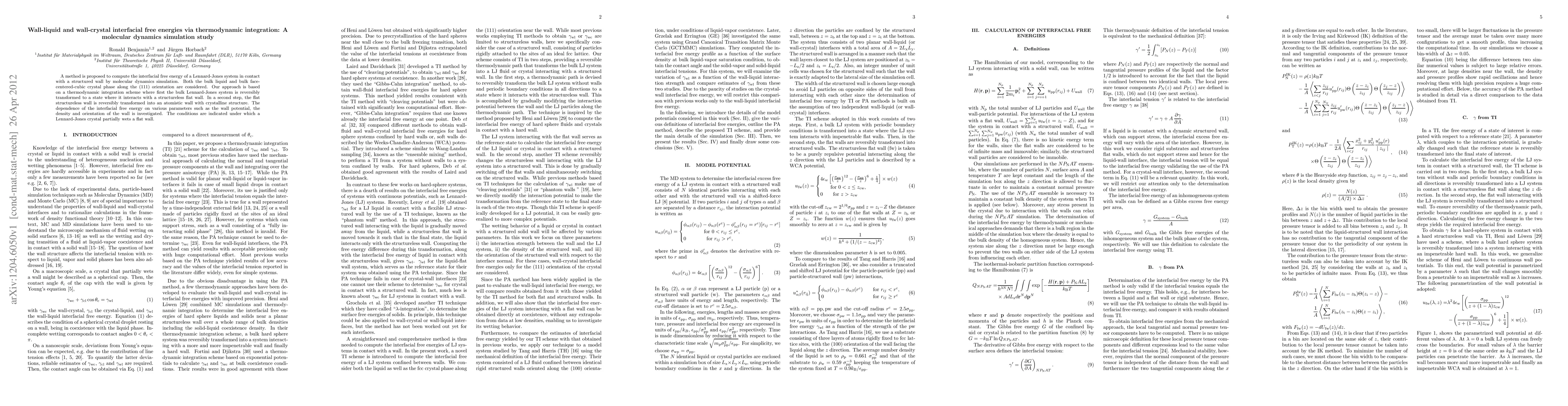This paper proposes a molecular dynamics simulation method to compute interfacial free energies for a Lennard-Jones system interacting with a structured wall, using a thermodynamic integration scheme. The study investigates the effects of wall potential, density, and orientation on the interfacial free energy, determining conditions for partial wetting of a Lennard-Jones crystal on a flat wall.