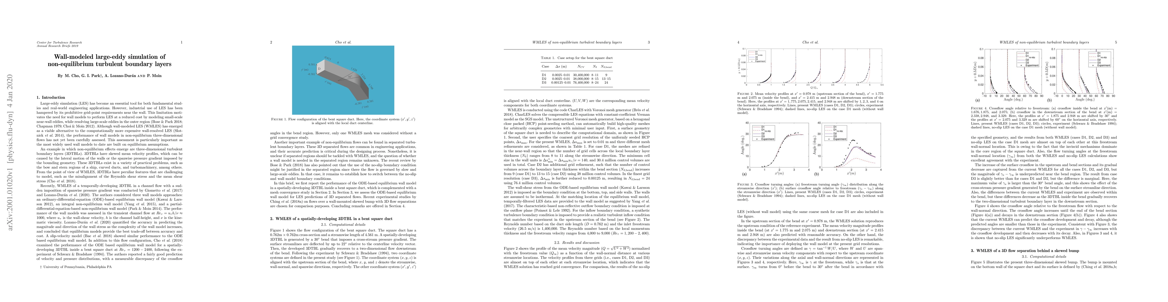 We conducted WMLES to examine the performance of a simple and widely used ODE-based equilibrium wall model in a spatially-developing 3D TBL inside a bent square duct (Schwarz and Bradshaw 1994) and 3D separated flows behind a skewed bump (Ching et al. 2018a,b; Ching and Eaton 2019). From the square duct simulation, the mean velocity profiles and crossflow angles in the outer region were predicted with high accuracy for all the considered mesh resolutions. Some disagreement was observed in the crossflow angles in the bend region where the non-equilibrium effect is most significant. Also, the simulation for the wall-mounted skewed bump showed that this simple ODE-based equilibrium wall model along with an adequate grid resolution around the 3D separation point resulted in reasonable predictions of 3D separating and reattaching flows, including mean velocity distributions, separation bubbles, and vortex structures in the bump wake.