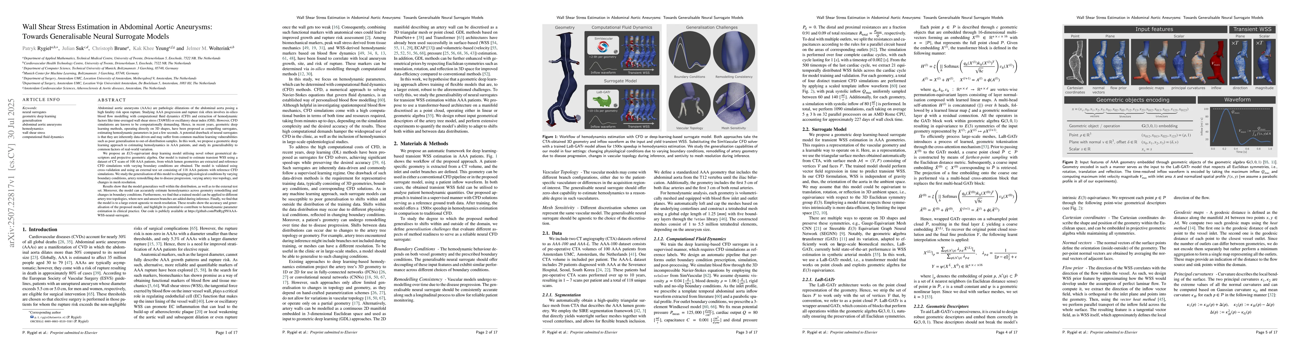 This work distinguishes itself by focusing on generalizable neural surrogate models for hemodynamic parameter estimation in AAAs, employing geometric deep learning techniques that exploit symmetries and operate directly on 3D shapes, offering significant computational advantages over traditional CFD simulations.