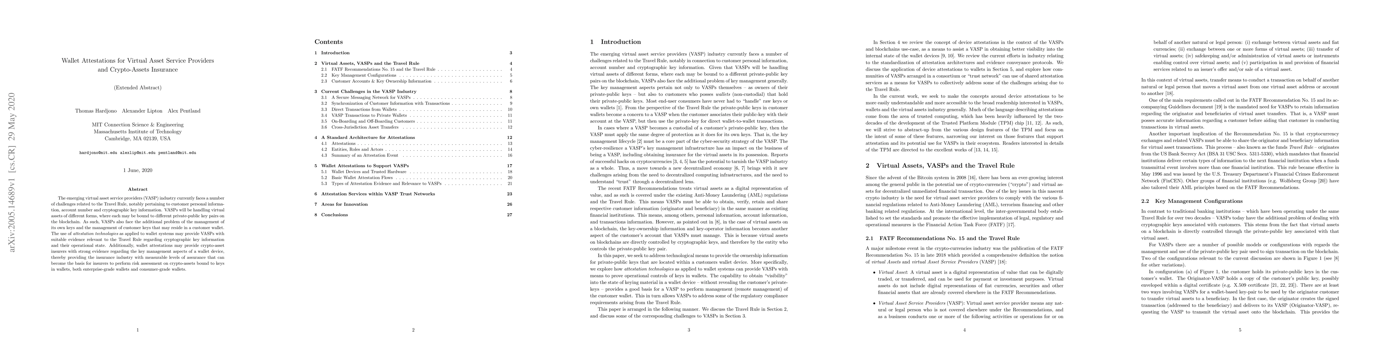 The emerging virtual asset service providers (VASP) industry currently faces a number of challenges related to the Travel Rule, notably pertaining to customer personal information, account number and cryptographic key information. VASPs will be handling virtual assets of different forms, where each may be bound to different private-public key pairs on the blockchain. As such, VASPs also face the additional problem of the management of its own keys and the management of customer keys that may reside in a customer wallet. The use of attestation technologies as applied to wallet systems may provide VASPs with suitable evidence relevant to the Travel Rule regarding cryptographic key information and their operational state. Additionally, wallet attestations may provide crypto-asset insurers with strong evidence regarding the key management aspects of a wallet device, thereby providing the insurance industry with measurable levels of assurance that can become the basis for insurers to perform risk assessment on crypto-assets bound to keys in wallets, both enterprise-grade wallets and consumer-grade wallets.