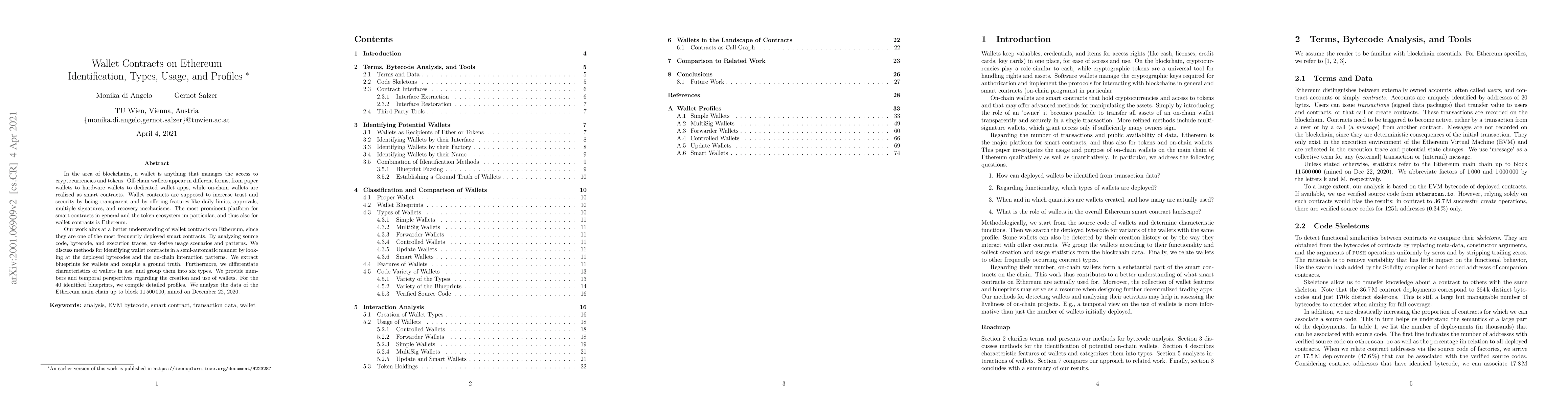In the area of blockchains, a wallet is anything that manages the access to cryptocurrencies and tokens. Off-chain wallets appear in different forms, from paper wallets to hardware wallets to dedicated wallet apps, while on-chain wallets are realized as smart contracts. Wallet contracts are supposed to increase trust and security by being transparent and by offering features like daily limits, approvals, multiple signatures, and recovery mechanisms. The most prominent platform for smart contracts in general and the token ecosystem im particular, and thus also for wallet contracts is Ethereum. Our work aims at a better understanding of wallet contracts on Ethereum, since they are one of the most frequently deployed smart contracts. By analyzing source code, bytecode, and execution traces, we derive usage scenarios and patterns. We discuss methods for identifying wallet contracts in a semi-automatic manner by looking at the deployed bytecodes and the on-chain interaction patterns. We extract blueprints for wallets and compile a ground truth. Furthermore, we differentiate characteristics of wallets in use, and group them into six types. We provide numbers and temporal perspectives regarding the creation and use of wallets. For the 40 identified blueprints, we compile detailed profiles. We analyze the data of the Ethereum main chain up to block 11,500,000, mined on December 22, 2020.