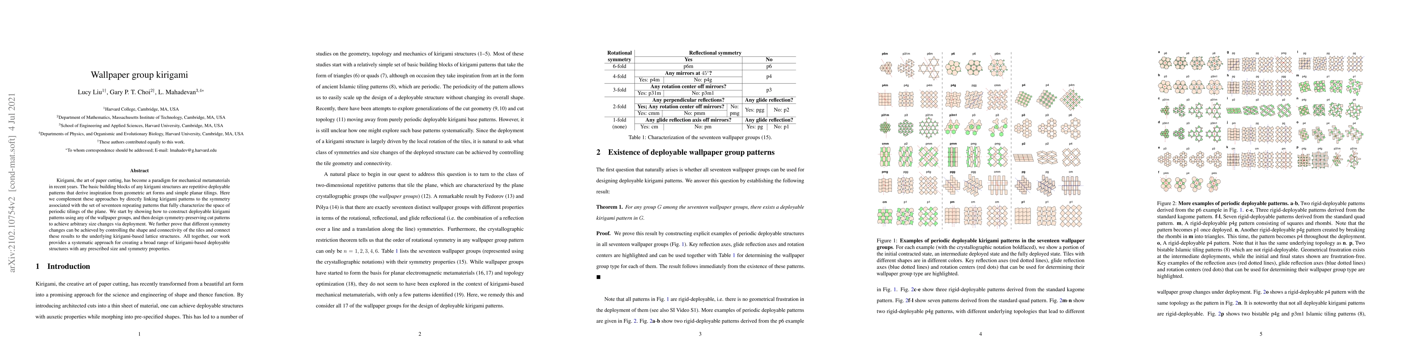 This paper explores the application of wallpaper group symmetry to kirigami, creating deployable patterns that can change size while preserving symmetry. It systematically links kirigami designs to the seventeen wallpaper groups, enabling the design of kirigami-based structures with specific size and symmetry properties.