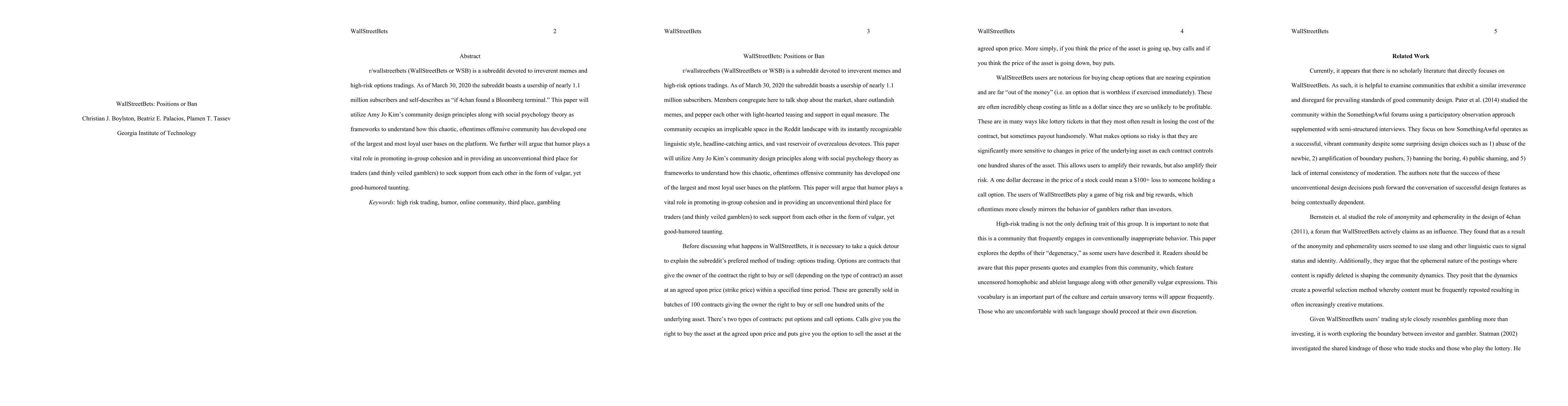 r/wallstreetbets (WallStreetBets or WSB) is a subreddit devoted to irreverent memes and high-risk options trading. As of March 30, 2020, the subreddit boasts a usership of nearly 1.1 millions subscribers and self-describes as "if 4chan found a Bloomberg terminal." This paper will utilize Amy Jo Kim's community design principles along with social psychology theory as frameworks to understand how this chaotic, oftentimes offensive community has developed one of the largest and most loyal user bases on the platform. We will further argue that humor plays a vital role in promoting in-group cohesion and in providing an unconventional third place for traders (and thinly veiled gamblers) to seek support from each other in the form of vulgar, yet good-humored taunting.