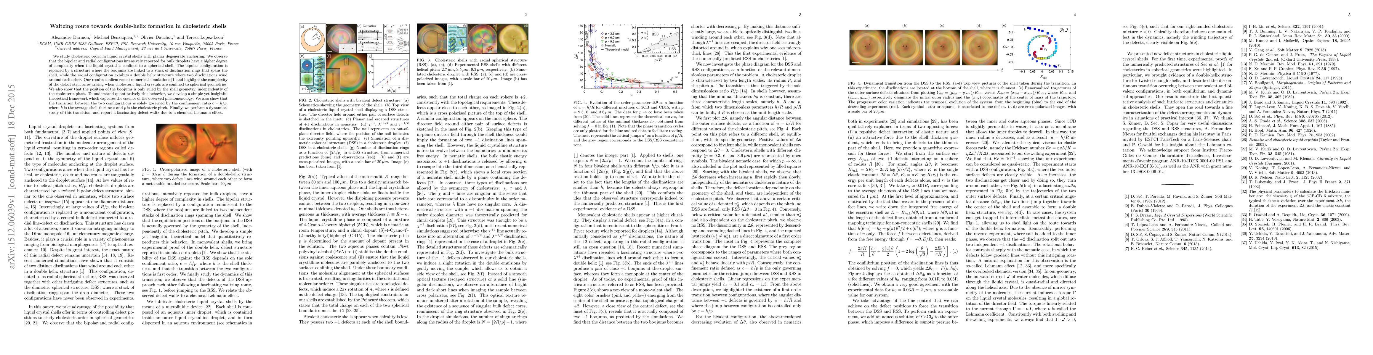 This paper investigates cholesteric order in liquid crystal shells, revealing complex defect structures such as linked boojums and double helix formations. It develops a theoretical framework to explain the observed phenomena and identifies the confinement ratio as the key factor governing the transition between configurations.