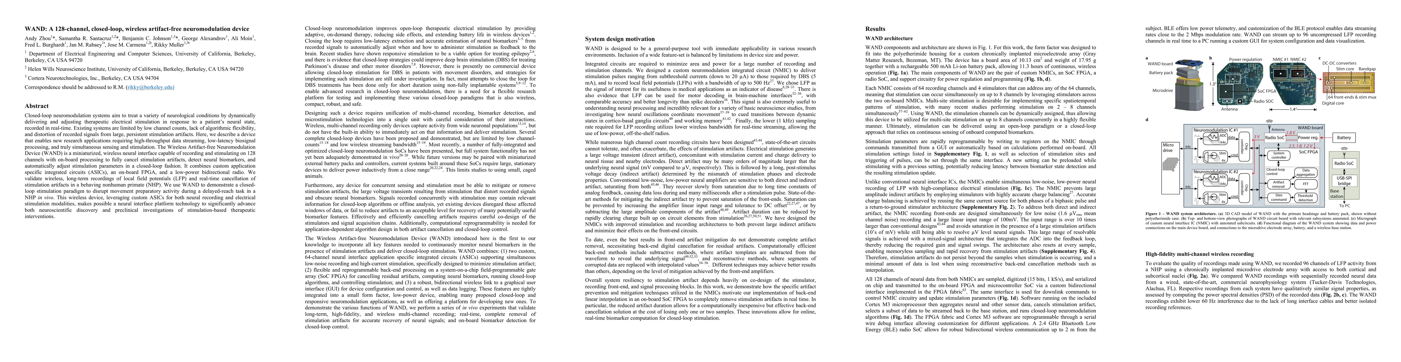 The WAND device is a 128-channel wireless neuromodulation system that enables real-time, closed-loop neurostimulation and artifact-free neural recording. It uses custom ASICs and an on-board FPGA to cancel stimulation artifacts and adjust parameters dynamically, validated in a nonhuman primate.