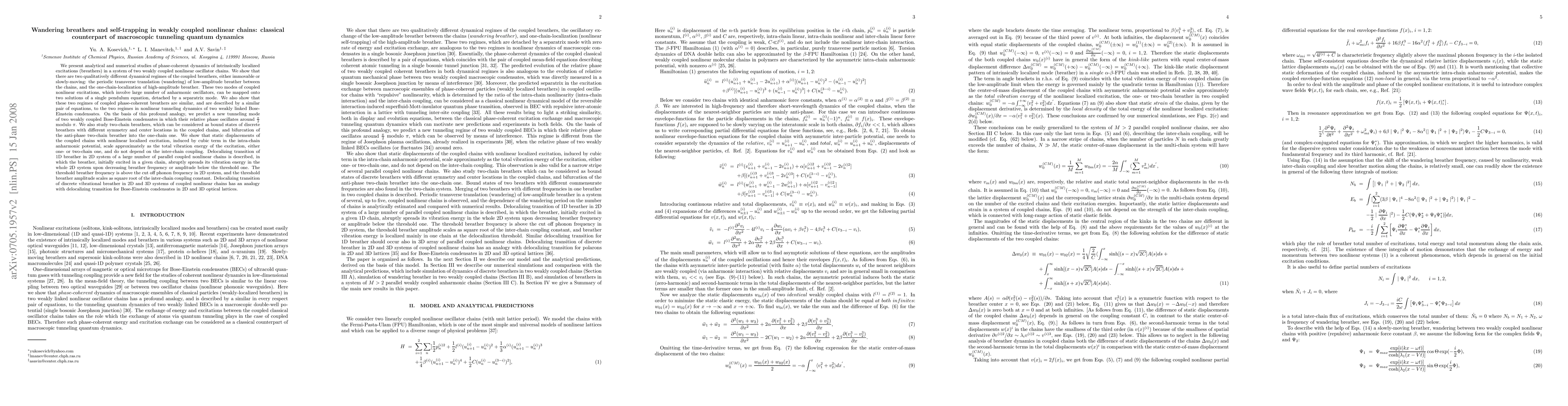 This paper investigates the dynamics of breathers in weakly coupled nonlinear oscillator chains, identifying two regimes: wandering breathers that periodically shift between chains, and localized high-amplitude breathers. It also explores the delocalizing transition where breathers spread energy across multiple chains, analogous to Bose-Einstein condensates in optical lattices.