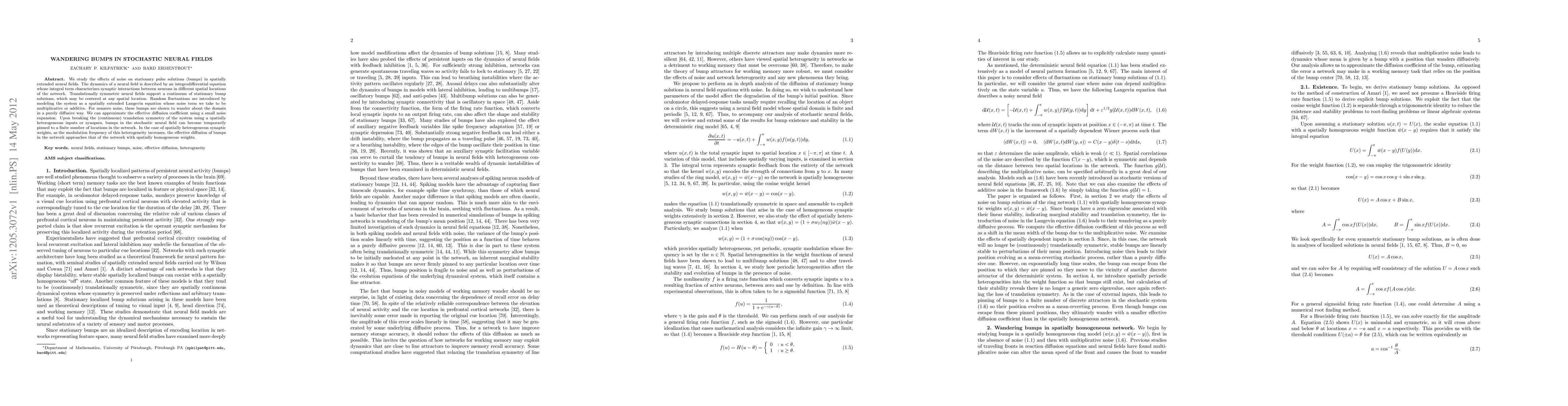 This paper investigates the impact of noise on stationary pulse solutions (bumps) in spatially extended neural fields, showing that nonzero noise causes these bumps to wander diffusively. It also explores how breaking translation symmetry through heterogeneous inputs or synapses can temporarily pin the bumps, with increasing modulation frequency restoring the effective diffusion.