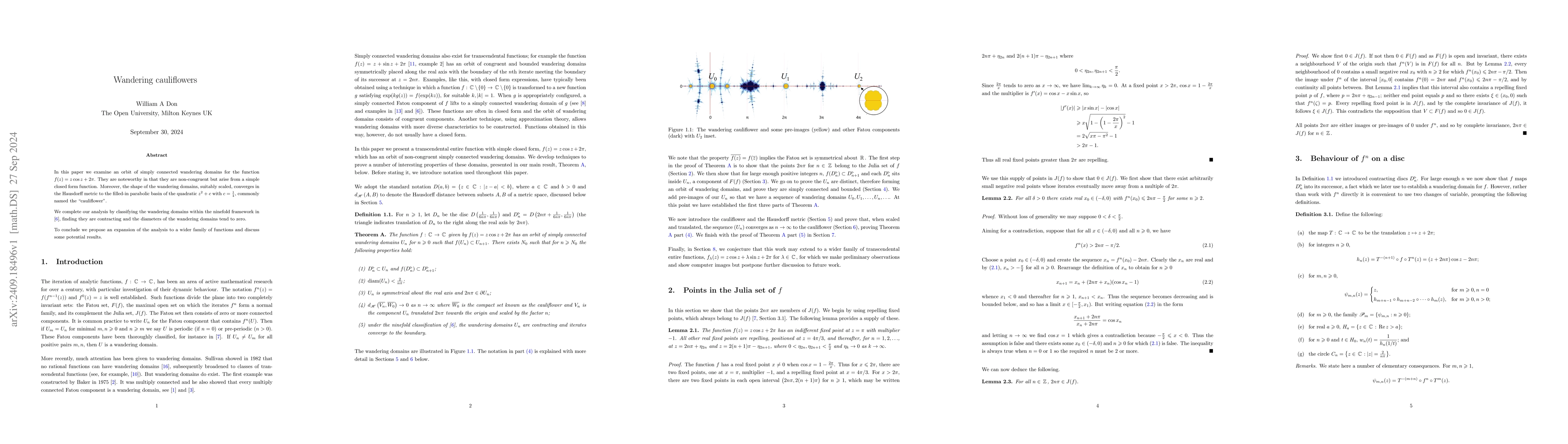 The research examines an orbit of simply connected wandering domains for the function f(z) = zcosz + 2π, demonstrating their non-congruence and convergence in the Hausdorff metric to the filled-in parabolic basin of the quadratic z^2 + c with c = 1/4, known as the 'cauliflower'.