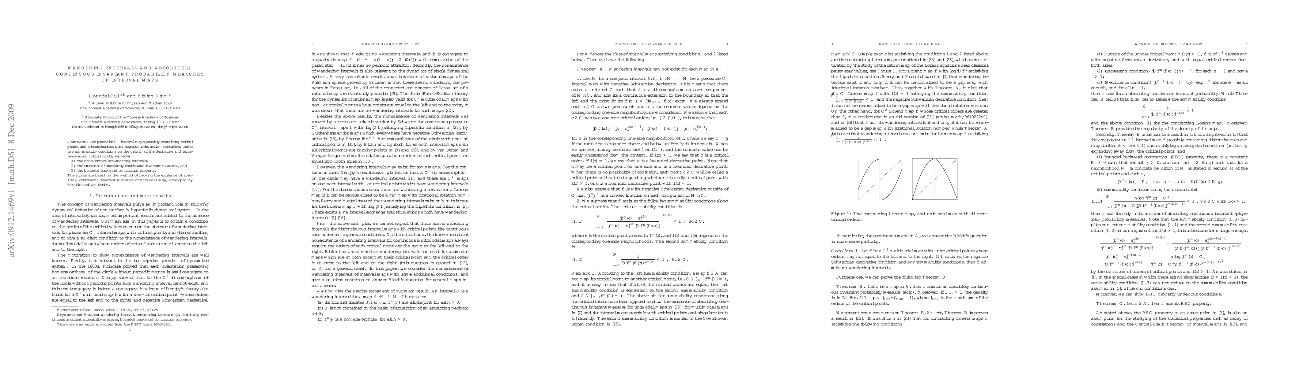 For piecewise $C^1$ interval maps possibly containing critical points and discontinuities with negative Schwarzian derivative, under two summability conditions on the growth of the derivative and recurrence along critical orbits, we prove the nonexistence of wandering intervals, the existence of absolutely continuous invariant measures, and the bounded backward contraction property. The proofs are based on the method of proving the existence of absolutely continuous invariant measures of unimodal map, developed by Nowicki and van Strien.