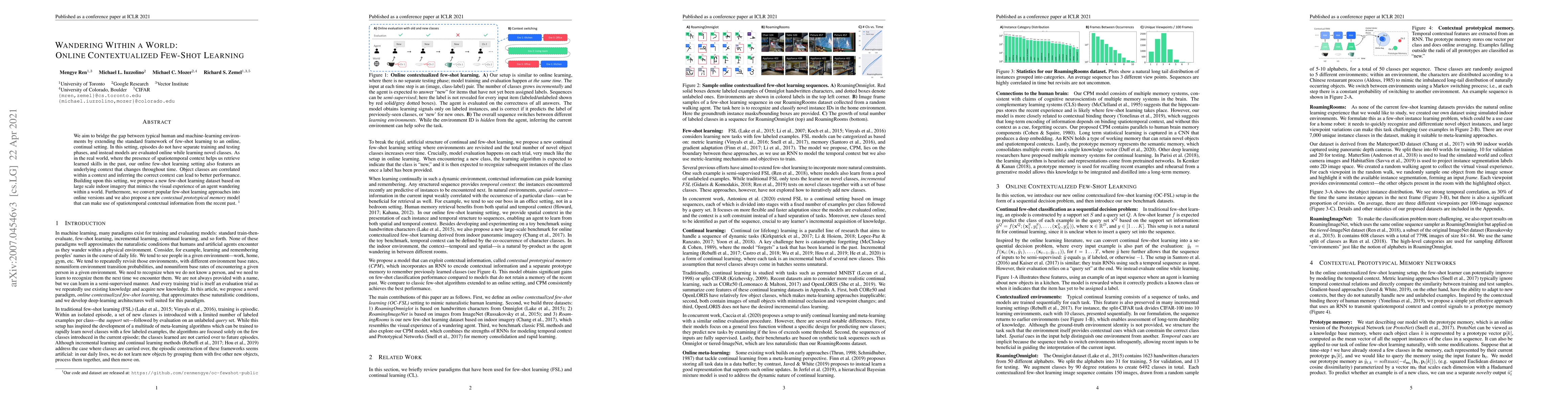 We aim to bridge the gap between typical human and machine-learning environments by extending the standard framework of few-shot learning to an online, continual setting. In this setting, episodes do not have separate training and testing phases, and instead models are evaluated online while learning novel classes. As in the real world, where the presence of spatiotemporal context helps us retrieve learned skills in the past, our online few-shot learning setting also features an underlying context that changes throughout time. Object classes are correlated within a context and inferring the correct context can lead to better performance. Building upon this setting, we propose a new few-shot learning dataset based on large scale indoor imagery that mimics the visual experience of an agent wandering within a world. Furthermore, we convert popular few-shot learning approaches into online versions and we also propose a new contextual prototypical memory model that can make use of spatiotemporal contextual information from the recent past.