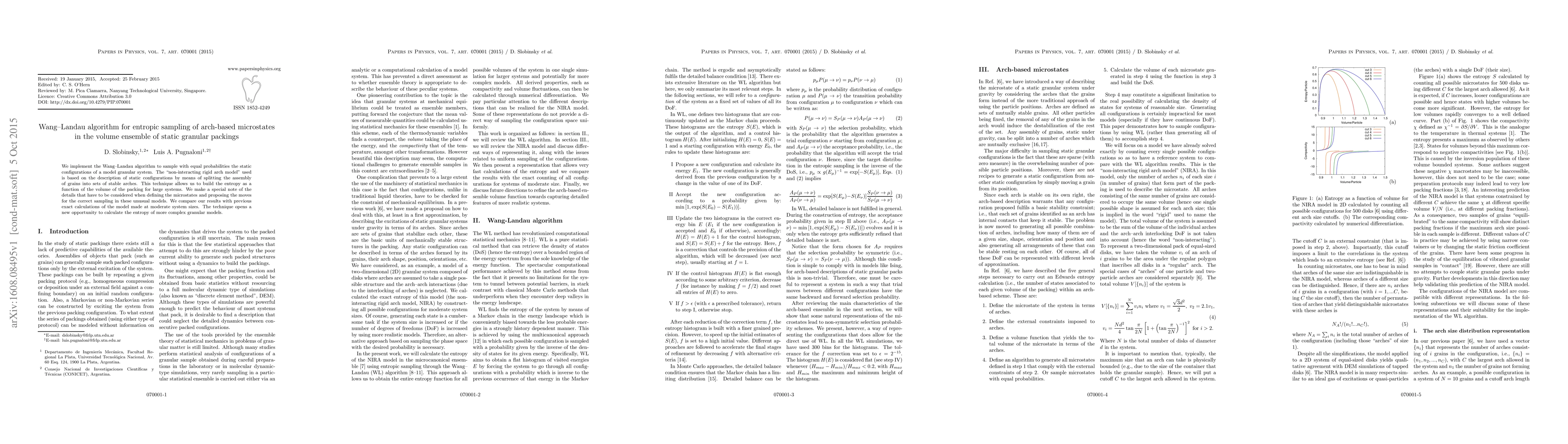 This paper applies the Wang-Landau algorithm to sample configurations of a granular system described by a "non-interacting rigid arch model," allowing for the calculation of entropy as a function of packing volume. The method provides a new approach for entropic sampling in complex granular models.