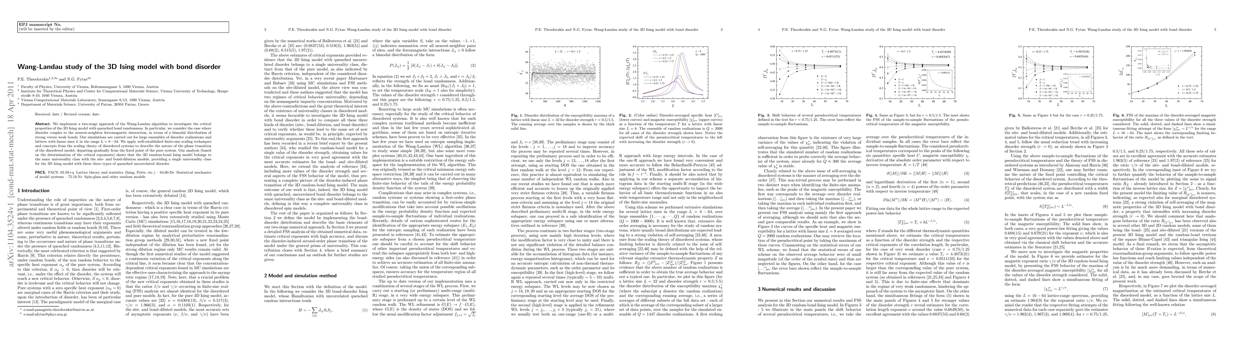 This study uses the Wang-Landau algorithm to explore the critical behavior of the 3D Ising model with bond disorder, revealing that it shares the same universality class as site- and bond-dilution models. The analysis identifies critical exponents that describe the phase transition in the disordered system.