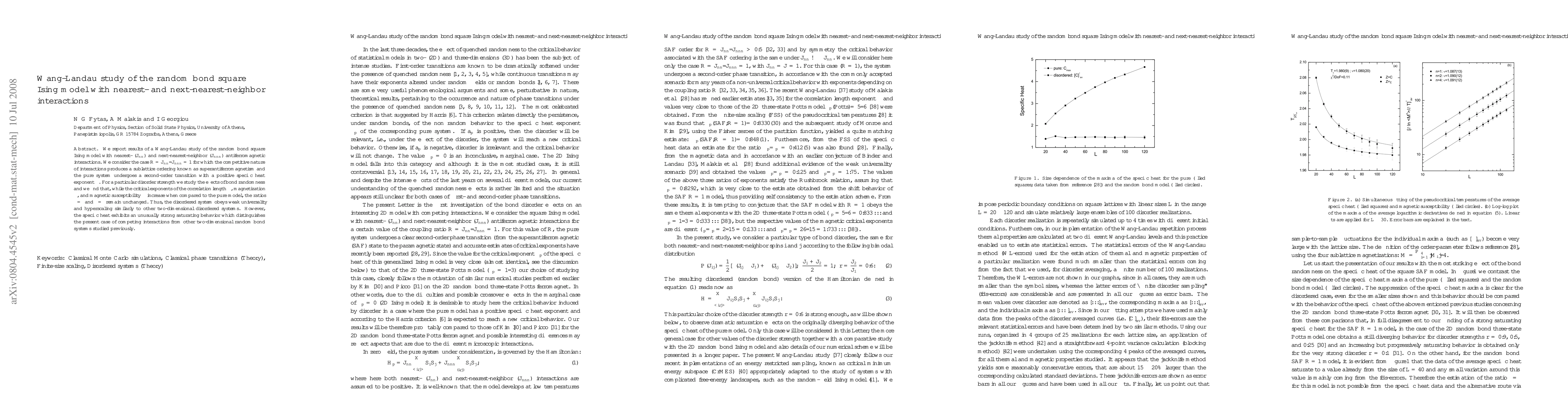 This paper reports on a Wang-Landau study of the random bond square Ising model with competing nearest- and next-nearest-neighbor antiferromagnetic interactions, revealing that disorder increases critical exponents but maintains weak universality and hyperscaling ratios. The specific heat shows unusual saturating behavior, distinguishing this system from other two-dimensional disordered models.