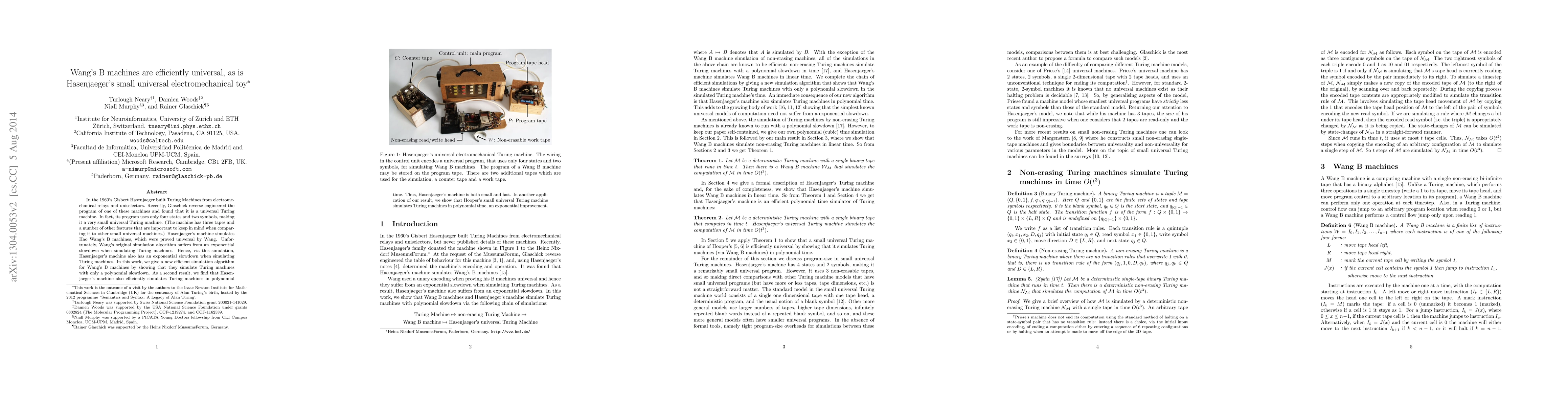 In the 1960's Gisbert Hasenjaeger built Turing Machines from electromechanical relays and uniselectors. Recently, Glaschick reverse engineered the program of one of these machines and found that it is a universal Turing machine. In fact, its program uses only four states and two symbols, making it a very small universal Turing machine. (The machine has three tapes and a number of other features that are important to keep in mind when comparing it to other small universal machines.) Hasenjaeger's machine simulates Hao Wang's B machines, which were proved universal by Wang. Unfortunately, Wang's original simulation algorithm suffers from an exponential slowdown when simulating Turing machines. Hence, via this simulation, Hasenjaeger's machine also has an exponential slowdown when simulating Turing machines. In this work, we give a new efficient simulation algorithm for Wang's B machines by showing that they simulate Turing machines with only a polynomial slowdown. As a second result, we find that Hasenjaeger's machine also efficiently simulates Turing machines in polynomial time. Thus, Hasenjaeger's machine is both small and fast. In another application of our result, we show that Hooper's small universal Turing machine simulates Turing machines in polynomial time, an exponential improvement.