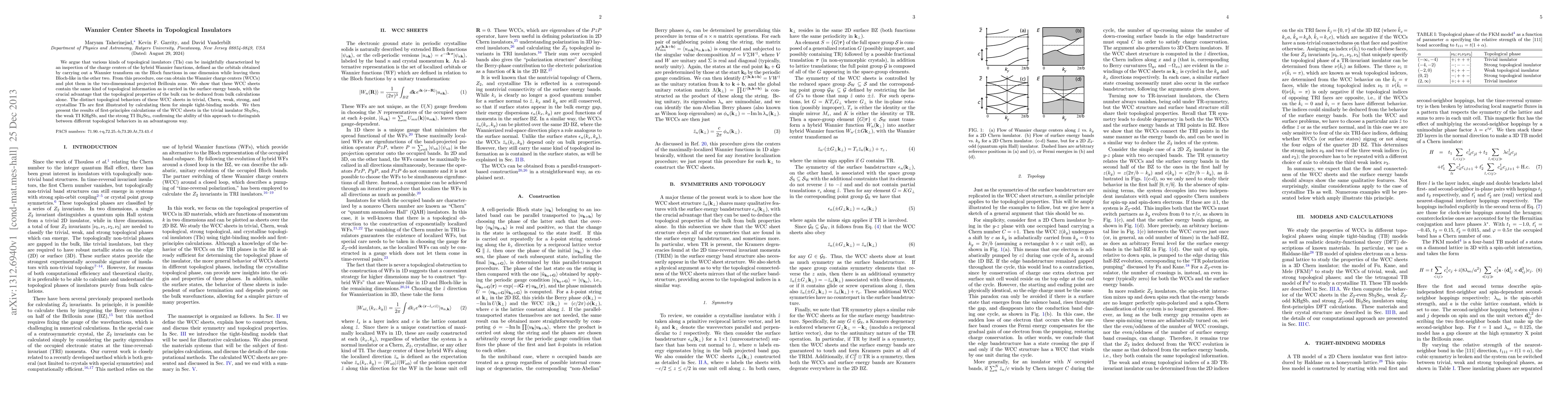 We argue that various kinds of topological insulators (TIs) can be insightfully characterized by an inspection of the charge centers of the hybrid Wannier functions, defined as the orbitals obtained by carrying out a Wannier transform on the Bloch functions in one dimension while leaving them Bloch-like in the other two. From this procedure, one can obtain the Wannier charge centers (WCCs) and plot them in the two-dimensional projected Brillouin zone. We show that these WCC sheets contain the same kind of topological information as is carried in the surface energy bands, with the crucial advantage that the topological properties of the bulk can be deduced from bulk calculations alone. The distinct topological behaviors of these WCC sheets in trivial, Chern, weak, strong, and crystalline TIs are first illustrated by calculating them for simple tight-binding models. We then present the results of first-principles calculations of the WCC sheets in the trivial insulator Sb$_2$Se$_3$, the weak TI KHgSb, and the strong TI Bi$_2$Se$_3$, confirming the ability of this approach to distinguish between different topological behaviors in an advantageous way.