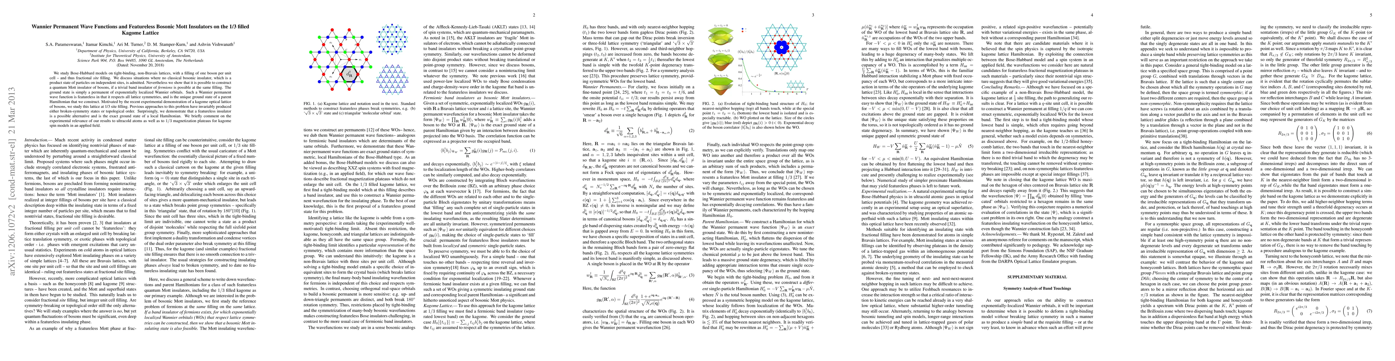 We study Bose-Hubbard models on tight-binding, non-Bravais lattices, with a filling of one boson per unit cell -- and thus fractional site filling. At integer filling of a unit cell neither symmetry breaking nor topological order is required, and in principle a trivial and featureless (i.e., symmetry-unbroken) insulator is allowed. We demonstrate by explicit construction of a family of wavefunctions that such a featureless Mott insulating state exists at 1/3 filling on the kagome lattice, and construct Hamiltonians for which these wavefunctions are exact ground states. We briefly comment on the experimental relevance of our results to cold atoms in optical lattices. Such wavefunctions also yield 1/3 magnetization plateau states for spin models in an applied field. The featureless Mott states we discuss can be generalized to any lattice for which symmetric exponentially localized Wannier orbitals can be found at the requisite filling, and their wavefunction is given by the permanent over all Wannier orbitals.