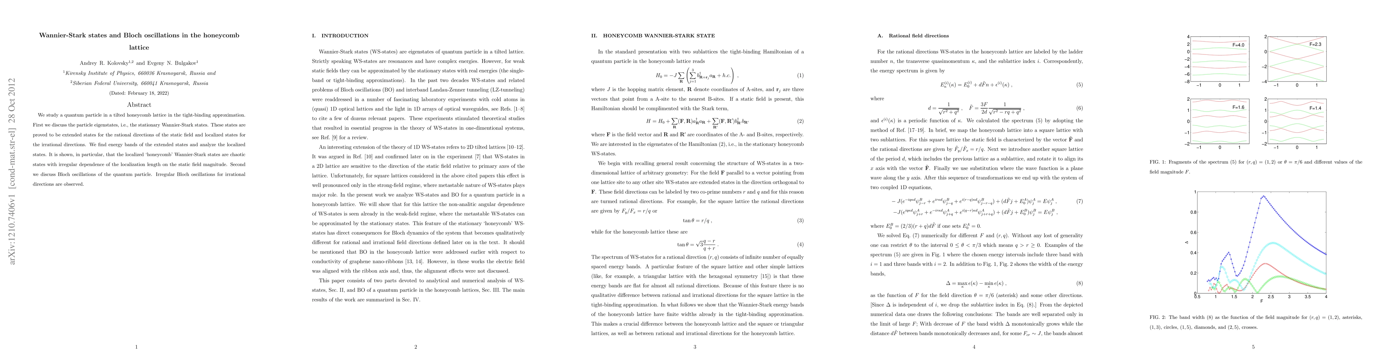 This paper investigates quantum particle behavior in a tilted honeycomb lattice, focusing on Wannier-Stark states and Bloch oscillations. It finds that Wannier-Stark states are extended for rational directions and localized, chaotic states for irrational directions. Additionally, it observes irregular Bloch oscillations for irrational directions.
