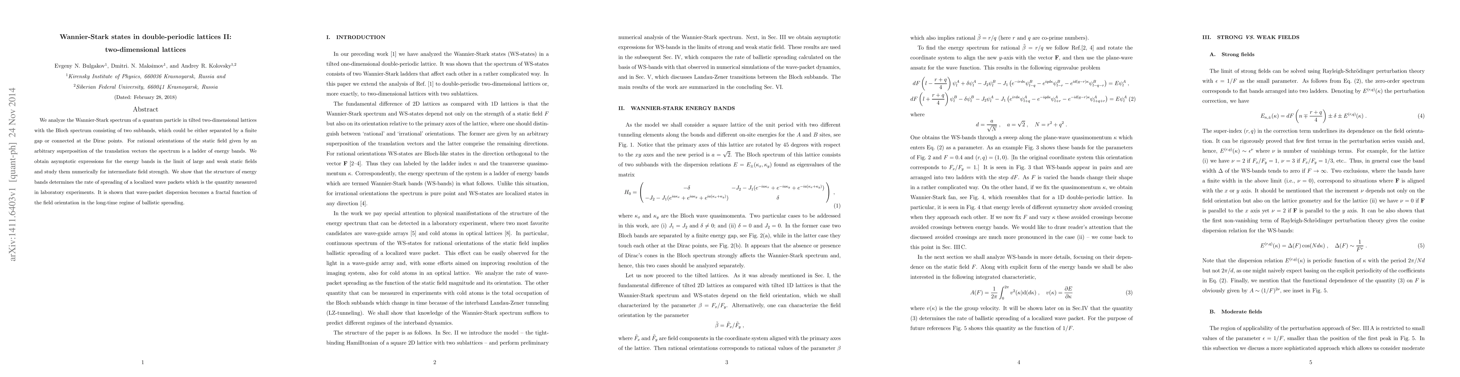 We analyze the Wannier-Stark spectrum of a quantum particle in tilted two-dimensional lattices with the Bloch spectrum consisting of two subbands, which could be either separated by a finite gap or connected at the Dirac points. For rational orientations of the static field given by an arbitrary superposition of the translation vectors the spectrum is a ladder of energy bands. We obtain asymptotic expressions for the energy bands in the limit of large and weak static fields and study them numerically for intermediate field strength. We show that the structure of energy bands determines the rate of spreading of a localized wave packets which is the quantity measured in laboratory experiments. It is shown that wave-packet dispersion becomes a fractal function of the field orientation in the long-time regime of ballistic spreading.
