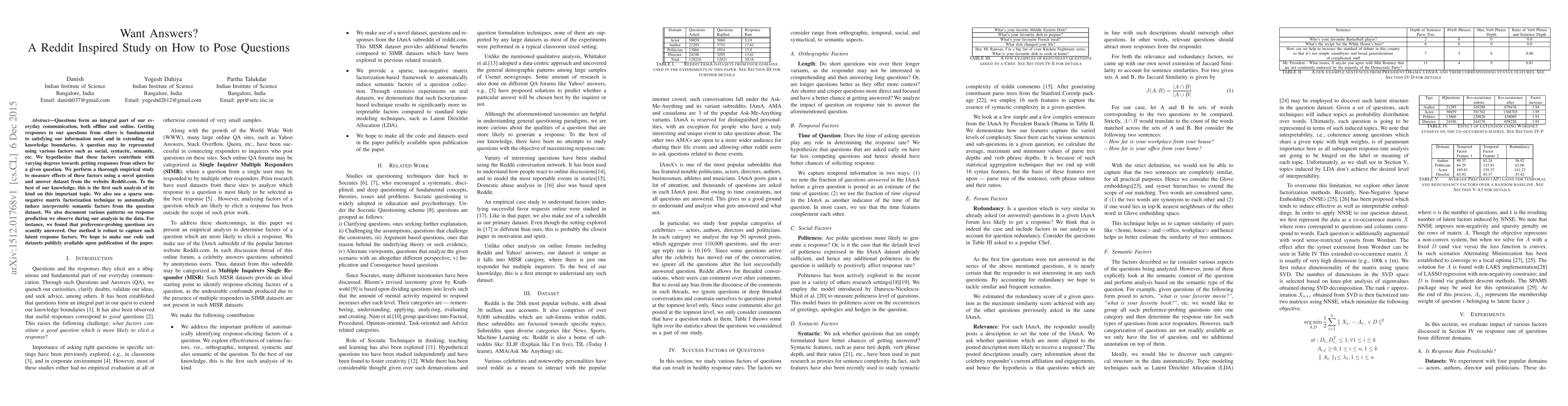 Questions form an integral part of our everyday communication, both offline and online. Getting responses to our questions from others is fundamental to satisfying our information need and in extending our knowledge boundaries. A question may be represented using various factors such as social, syntactic, semantic, etc. We hypothesize that these factors contribute with varying degrees towards getting responses from others for a given question. We perform a thorough empirical study to measure effects of these factors using a novel question and answer dataset from the website Reddit.com. To the best of our knowledge, this is the first such analysis of its kind on this important topic. We also use a sparse nonnegative matrix factorization technique to automatically induce interpretable semantic factors from the question dataset. We also document various patterns on response prediction we observe during our analysis in the data. For instance, we found that preference-probing questions are scantily answered. Our method is robust to capture such latent response factors. We hope to make our code and datasets publicly available upon publication of the paper.