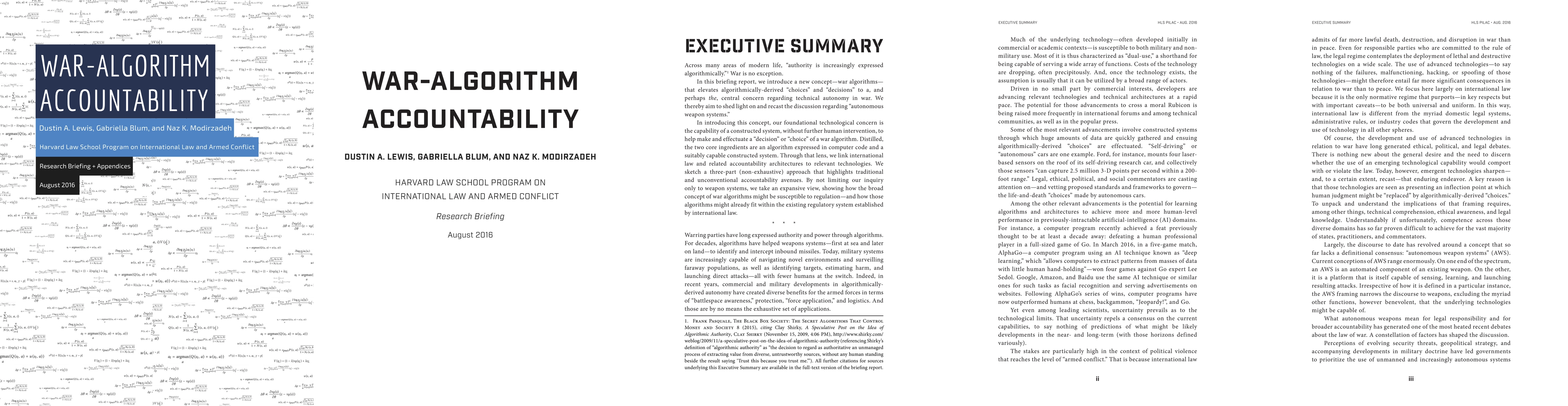 In this briefing report, we introduce a new concept (war algorithms) that elevates algorithmically-derived choices and decisions to a, and perhaps the, central concern regarding technical autonomy in war. We thereby aim to shed light on and recast the discussion regarding autonomous weapon systems. We define war algorithm as any algorithm that is expressed in computer code, that is effectuated through a constructed system, and that is capable of operating in relation to armed conflict. In introducing this concept, our foundational technological concern is the capability of a constructed system, without further human intervention, to help make and effectuate a decision or choice of a war algorithm. Distilled, the two core ingredients are an algorithm expressed in computer code and a suitably capable constructed system. Through that lens, we link international law and related accountability architectures to relevant technologies. We sketch a three-part (non-exhaustive) approach that highlights traditional and unconventional accountability avenues. We focus largely on international law because it is the only normative regime that purports, in key respects but with important caveats, to be both universal and uniform. By not limiting our inquiry only to weapon systems, we take an expansive view, showing how the broad concept of war algorithms might be susceptible to regulation, and how those algorithms might already fit within the existing regulatory system established by international law.