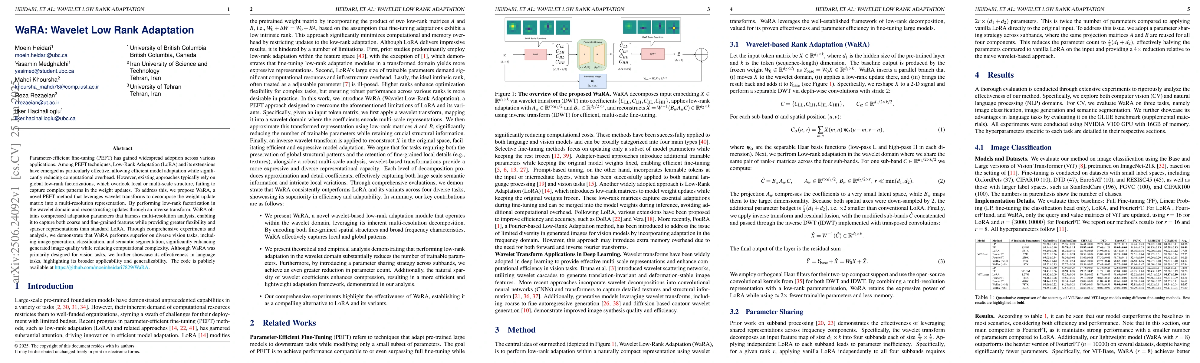Parameter-efficient fine-tuning (PEFT) has gained widespread adoption across various applications. Among PEFT techniques, Low-Rank Adaptation (LoRA) and its extensions have emerged as particularly effective, allowing efficient model adaptation while significantly reducing computational overhead. However, existing approaches typically rely on global low-rank factorizations, which overlook local or multi-scale structure, failing to capture complex patterns in the weight updates. To address this, we propose WaRA, a novel PEFT method that leverages wavelet transforms to decompose the weight update matrix into a multi-resolution representation. By performing low-rank factorization in the wavelet domain and reconstructing updates through an inverse transform, WaRA obtains compressed adaptation parameters that harness multi-resolution analysis, enabling it to capture both coarse and fine-grained features while providing greater flexibility and sparser representations than standard LoRA. Through comprehensive experiments and analysis, we demonstrate that WaRA performs superior on diverse vision tasks, including image generation, classification, and semantic segmentation, significantly enhancing generated image quality while reducing computational complexity. Although WaRA was primarily designed for vision tasks, we further showcase its effectiveness in language tasks, highlighting its broader applicability and generalizability. The code is publicly available at \href{GitHub}{https://github.com/moeinheidari7829/WaRA}.