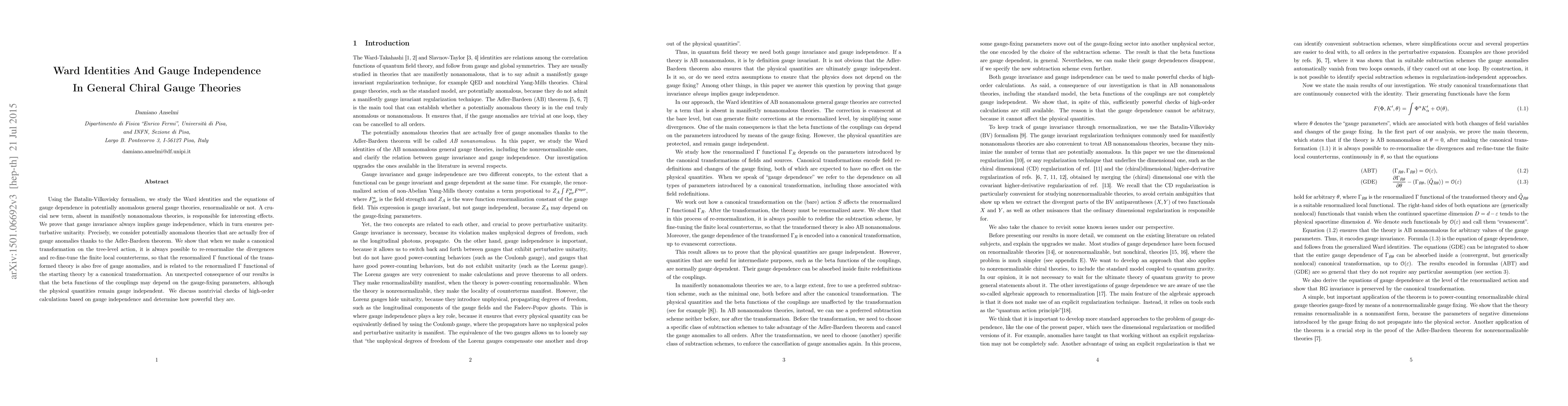 Using the Batalin-Vilkovisky formalism, we study the Ward identities and the equations of gauge dependence in potentially anomalous general gauge theories, renormalizable or not. A crucial new term, absent in manifestly nonanomalous theories, is responsible for interesting effects. We prove that gauge invariance always implies gauge independence, which in turn ensures perturbative unitarity. Precisely, we consider potentially anomalous theories that are actually free of gauge anomalies thanks to the Adler-Bardeen theorem. We show that when we make a canonical transformation on the tree-level action, it is always possible to re-renormalize the divergences and re-fine-tune the finite local counterterms, so that the renormalized $\Gamma $ functional of the transformed theory is also free of gauge anomalies, and is related to the renormalized $\Gamma $ functional of the starting theory by a canonical transformation. An unexpected consequence of our results is that the beta functions of the couplings may depend on the gauge-fixing parameters, although the physical quantities remain gauge independent. We discuss nontrivial checks of high-order calculations based on gauge independence and determine how powerful they are.