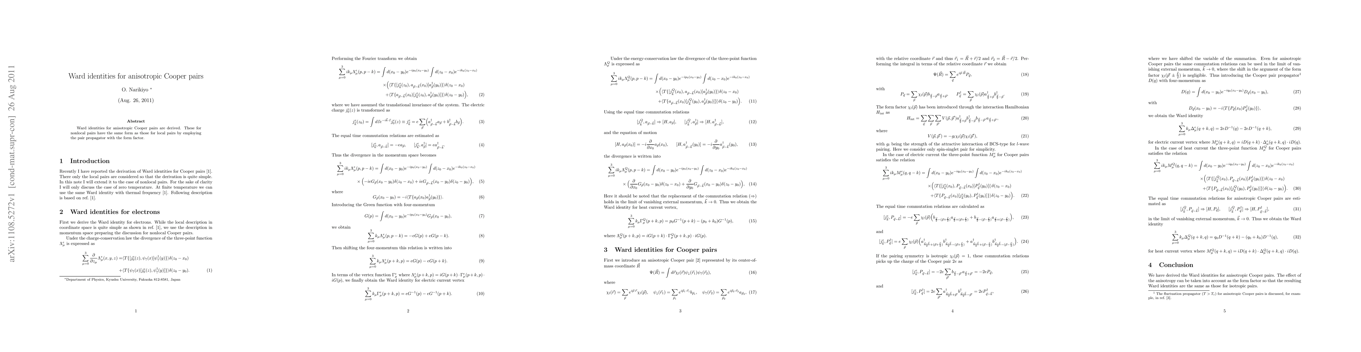Ward identities for anisotropic Cooper pairs are derived. These for nonlocal pairs have the same form as those for local pairs by employing the pair propagator with the form factor.