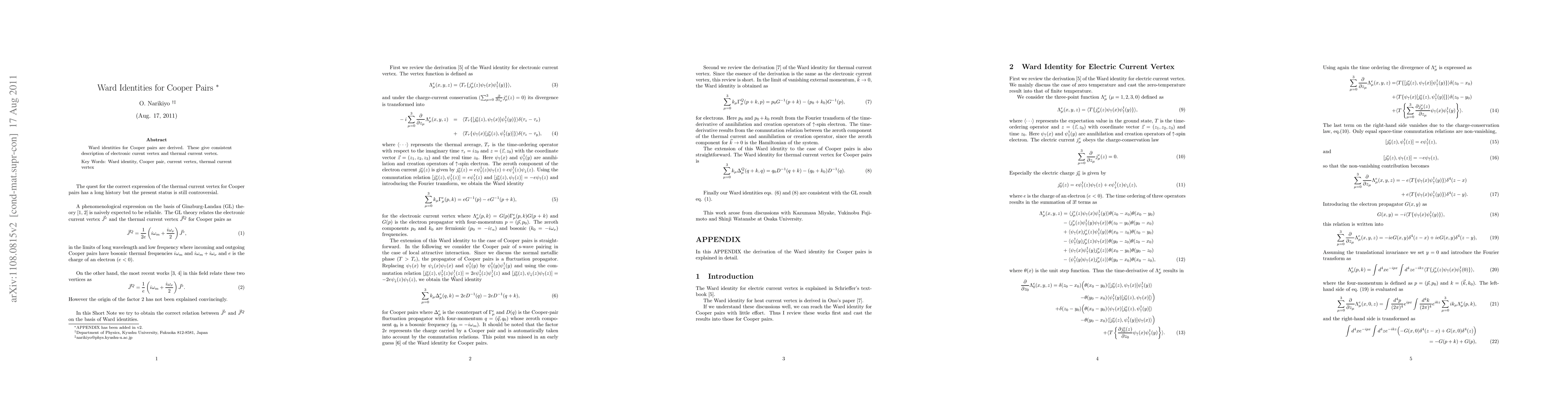 Summary: This paper derives Ward identities for Cooper pairs, providing a coherent framework for understanding the electronic current vertex and thermal current vertex in superconducting systems. These identities enhance the theoretical description of superconductivity.
