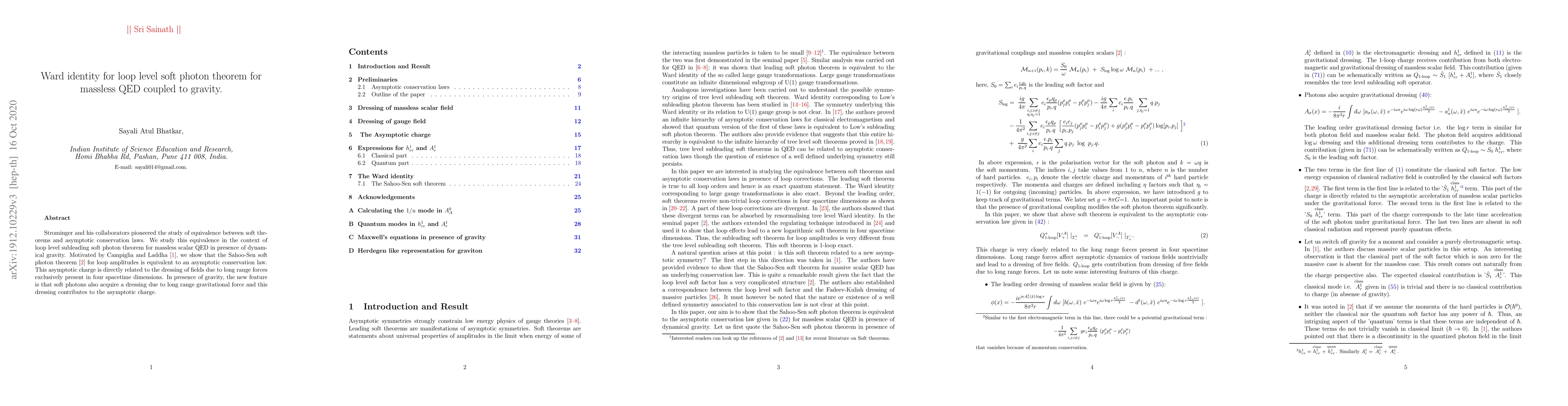 Title: Ward identity for loop level soft photon theorem for massless QED coupled to gravity Summary: This paper investigates the equivalence between the loop level subleading soft photon theorem in massless scalar QED with dynamical gravity and an asymptotic conservation law, showing that the Sahoo-Sen theorem is linked to a gravitationally influenced dressing effect on soft photons.