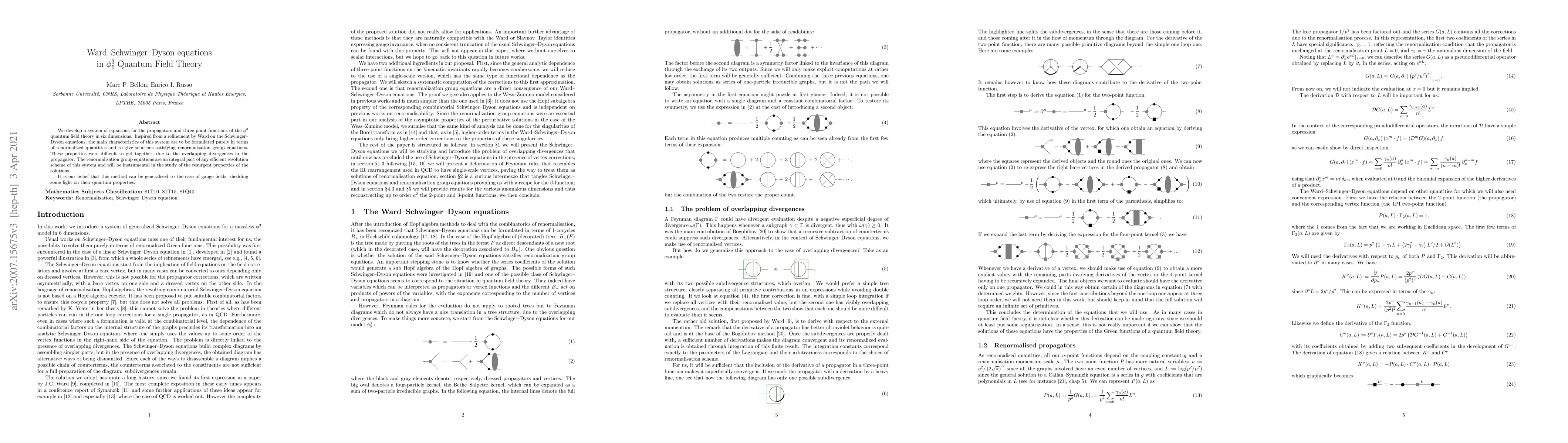 This paper develops a system of Ward-Schwinger-Dyson equations for the $\phi^3_6$ quantum field theory, focusing on renormalized quantities and ensuring solutions satisfy renormalization group equations. The method aims to generalize to gauge fields, enhancing the understanding of their quantum properties.