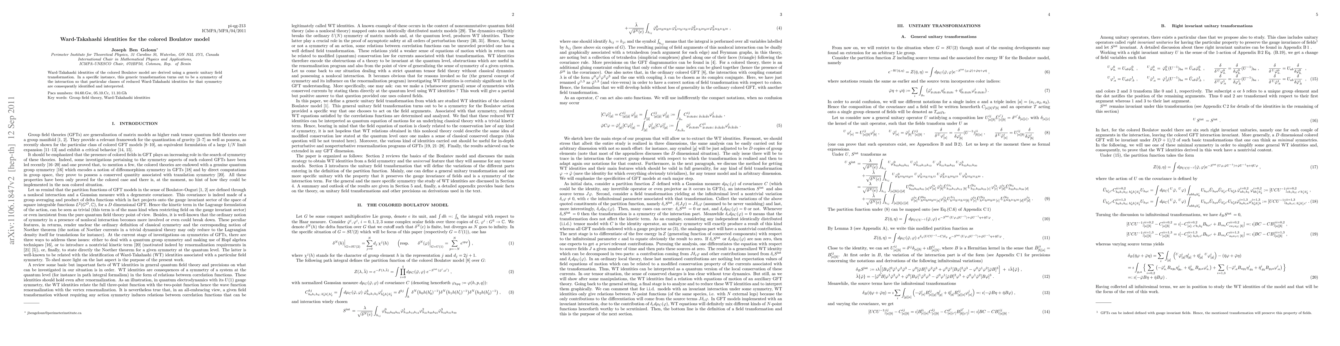 The paper derives Ward-Takahashi identities for the colored Boulatov model via a unitary field transformation, identifying specific symmetries and interpreting the corresponding reduced identities.