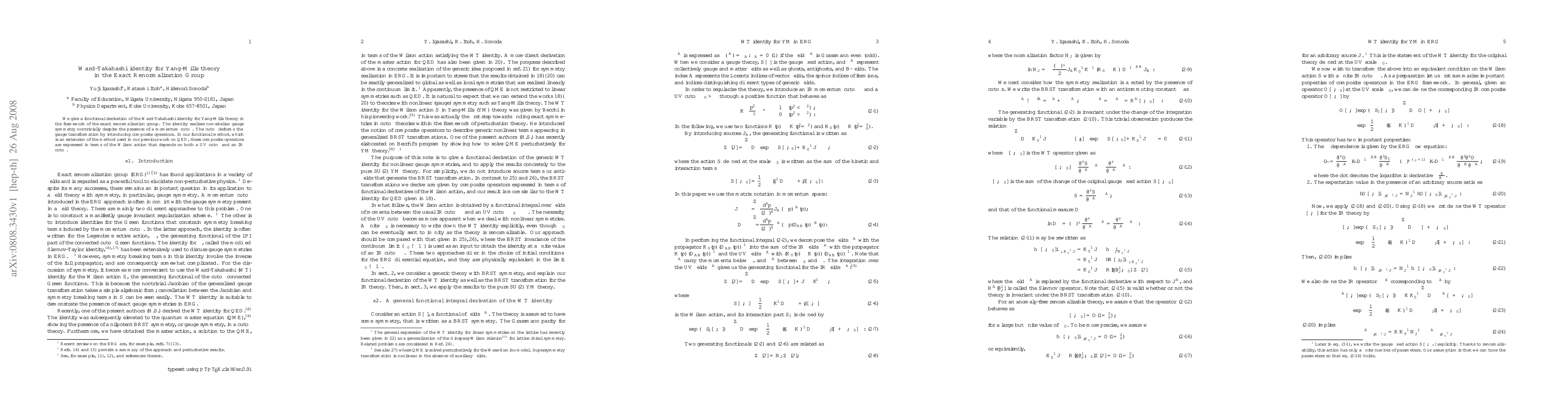 This paper derives the Ward-Takahashi identity for Yang-Mills theory within the exact renormalization group framework, demonstrating how non-abelian gauge symmetry persists despite a momentum cutoff, which introduces composite operators expressed via the Wilson action dependent on both UV and IR cutoffs.