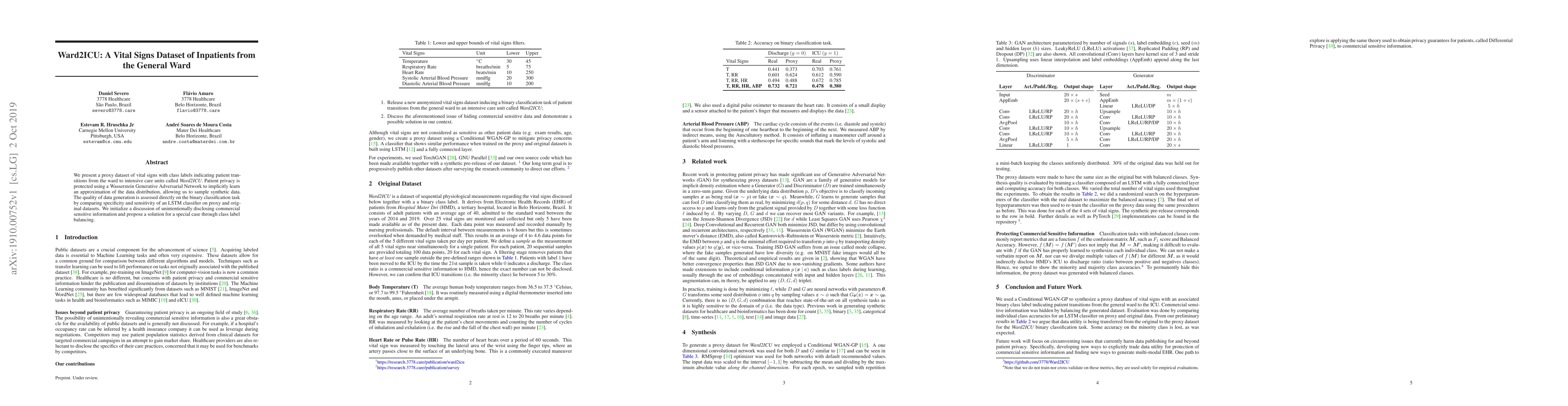 We present a proxy dataset of vital signs with class labels indicating patient transitions from the ward to intensive care units called Ward2ICU. Patient privacy is protected using a Wasserstein Generative Adversarial Network to implicitly learn an approximation of the data distribution, allowing us to sample synthetic data. The quality of data generation is assessed directly on the binary classification task by comparing specificity and sensitivity of an LSTM classifier on proxy and original datasets. We initialize a discussion of unintentionally disclosing commercial sensitive information and propose a solution for a special case through class label balancing