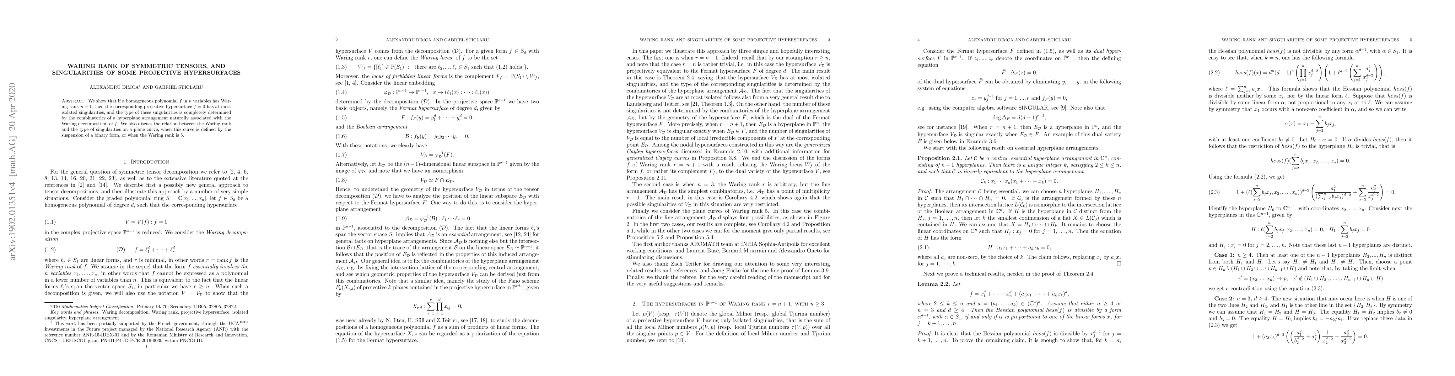 This paper demonstrates that a homogeneous polynomial with a Waring rank of $n+1$ corresponds to a projective hypersurface with only isolated singularities, whose types are determined by the combinatorics of a related hyperplane arrangement. It also explores the connection between Waring rank and singularities in plane curves defined by binary forms or with a Waring rank of 5.