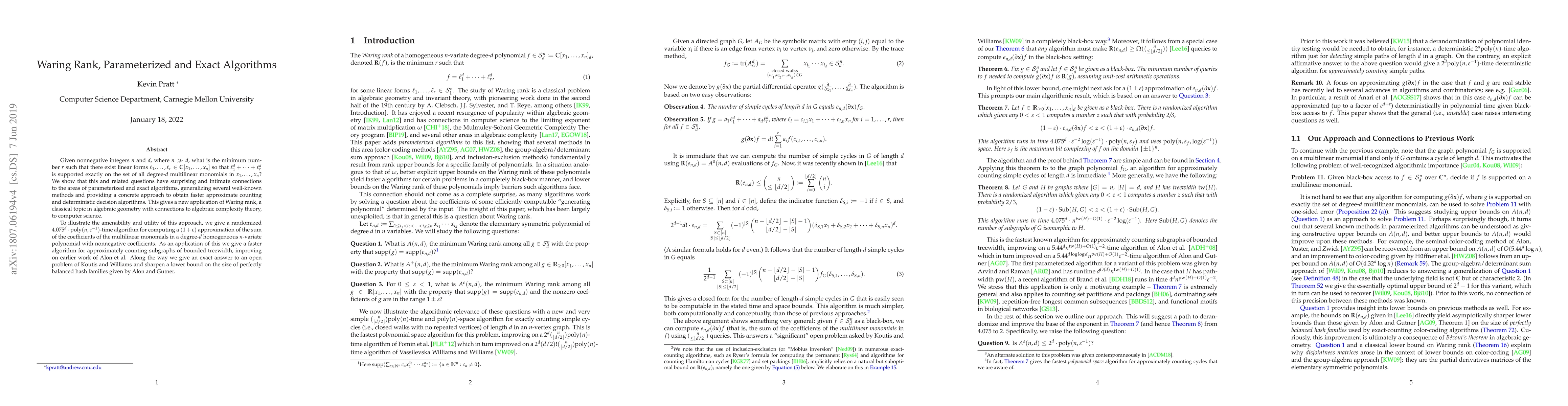 Given nonnegative integers $n$ and $d$, where $n \gg d$, what is the minimum number $r$ such that there exist linear forms $\ell_1, \ldots, \ell_r \in \mathbb{C}[x_1, \ldots, x_n]$ so that $\ell_1^d + \cdots + \ell_r^d$ is supported exactly on the set of all degree-$d$ multilinear monomials in $x_1, \ldots, x_n$? We show that this and related questions have surprising and intimate connections to the areas of parameterized and exact algorithms, generalizing several well-known methods and providing a concrete approach to obtain faster approximate counting and deterministic decision algorithms. This gives a new application of Waring rank, a classical topic in algebraic geometry with connections to algebraic complexity theory, to computer science. To illustrate the amenability and utility of this approach, we give a randomized $4.075^d \cdot \mathrm{poly}(n, \varepsilon^{-1})$-time algorithm for computing a $(1 + \varepsilon)$ approximation of the sum of the coefficients of the multilinear monomials in a degree-$d$ homogeneous $n$-variate polynomial with nonnegative coefficients. As an application of this we give a faster algorithm for approximately counting subgraphs of bounded treewidth, improving on earlier work of Alon et al. Along the way we give an exact answer to an open problem of Koutis and Williams and sharpen a lower bound on the size of perfectly balanced hash families given by Alon and Gutner.