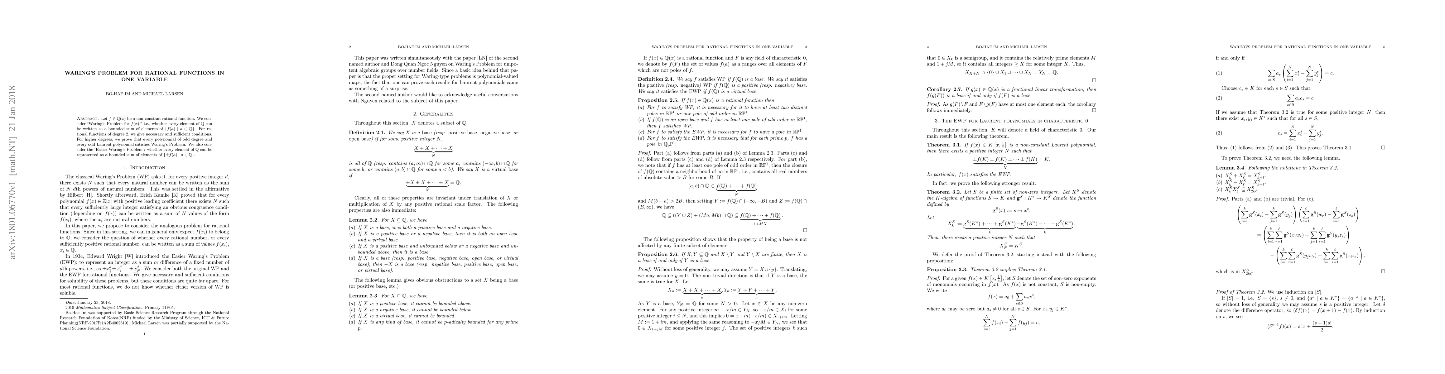 This paper investigates Waring's Problem for rational functions in one variable, determining necessary and sufficient conditions for rational functions of degree 2. It proves that polynomials of odd degree and odd Laurent polynomials satisfy Waring's Problem for rational functions, and explores the "Easier Waring's Problem" for bounded sums of ±f(a).