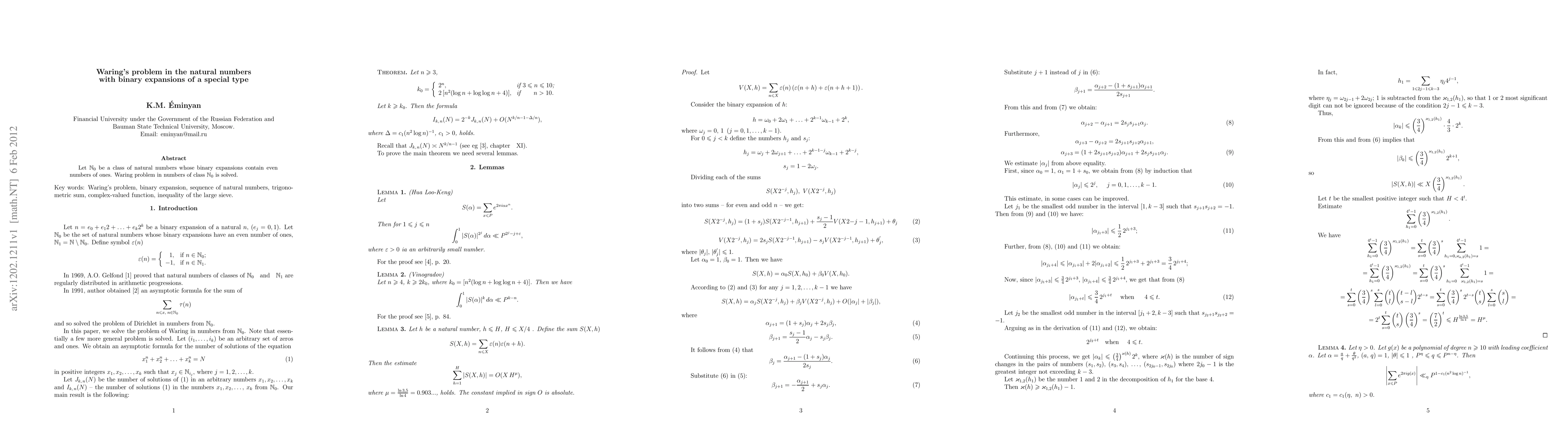 Let $\mathbb{N}_0$ be a class of natural numbers whose binary expansions contain even numbers of ones. Waring problem in numbers of class $\mathbb{N}_0$ is solved.