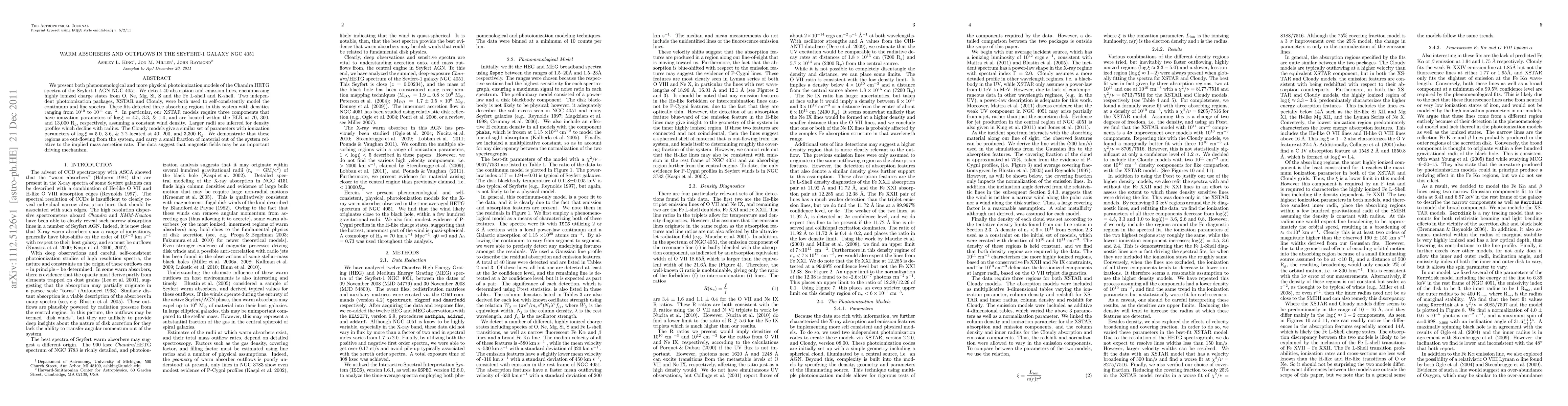 We present both phenomenological and more physical photoionization models of the Chandra HETG spectra of the Seyfert-1 AGN NGC 4051. We detect 40 absorption and emission lines, encompassing highly ionized charge states from O, Ne, Mg, Si, S and the Fe L-shell and K-shell. Two independent photoionization packages, XSTAR and Cloudy, were both used to self-consistently model the continuum and line spectra. These fits detected three absorbing regions in this system with densities ranging from 10^{10} to 10^{11} cm^{-3}. In particular, our XSTAR models require three components that have ionization parameters of log \xi = 4.5, 3.3, & 1.0, and are located within the BLR at 70, 300, and 13,000 R_g, respectively, assuming a constant wind density. Larger radii are inferred for density profiles which decline with radius. The Cloudy models give a similar set of parameters with ionization parameters of log \xi = 5.0, 3.6, & 2.2 located at 40, 200, and 3,300 R_g. We demonstrate that these regions are out-flowing from the system, and carry a small fraction of material out of the system relative to the implied mass accretion rate. The data suggest that magnetic fields may be an important driving mechanism.