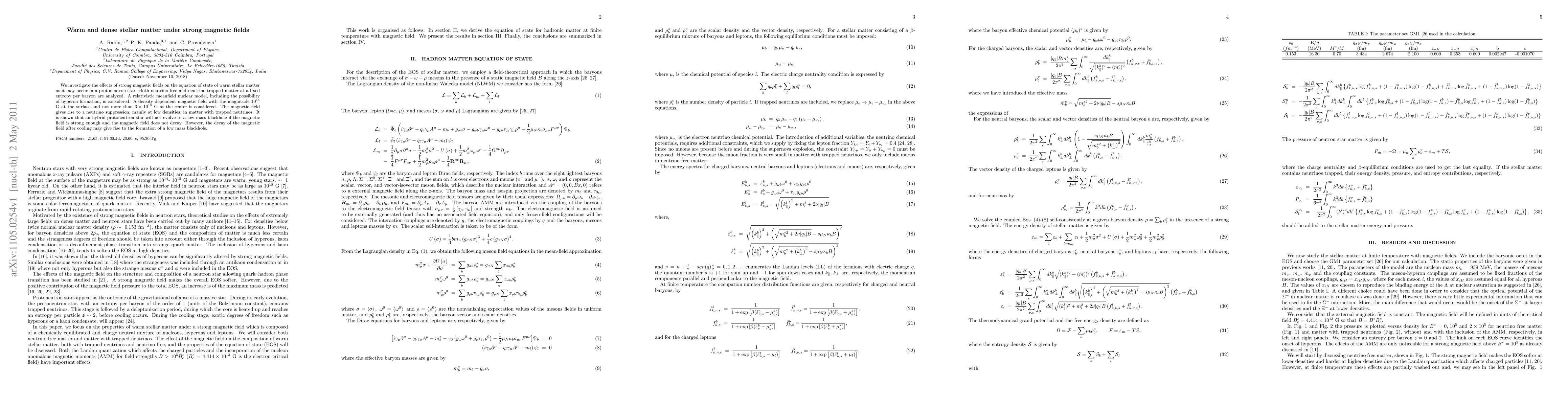 We investigate the effects of strong magnetic fields on the equation of state of warm stellar matter as it may occur in a protoneutron star. Both neutrino free and neutrino trapped matter at a fixed entropy per baryon are analyzed. A relativistic mean field nuclear model, including the possibility of hyperon formation, is considered. A density dependent magnetic field with the magnitude $10^{15}$ G at the surface and not more than $3\times 10^{18}$ G at the center is considered. The magnetic field gives rise to a neutrino suppression, mainly at low densities, in matter with trapped neutrinos. It is shown that an hybrid protoneutron star will not evolve to a low mass blackhole if the magnetic field is strong enough and the magnetic field does not decay. However, the decay of the magnetic field after cooling may give rise to the formation of a low mass blackhole.