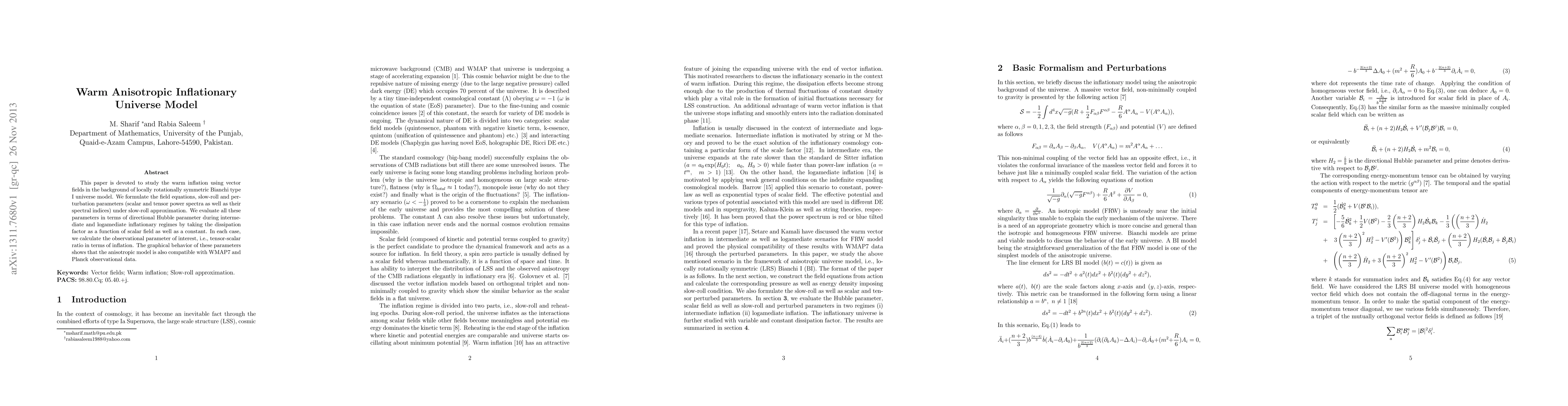 This paper explores warm inflation driven by vector fields in a locally rotationally symmetric Bianchi type I universe, calculating slow-roll and perturbation parameters. It finds that the anisotropic model aligns with observational data from WMAP7 and Planck.