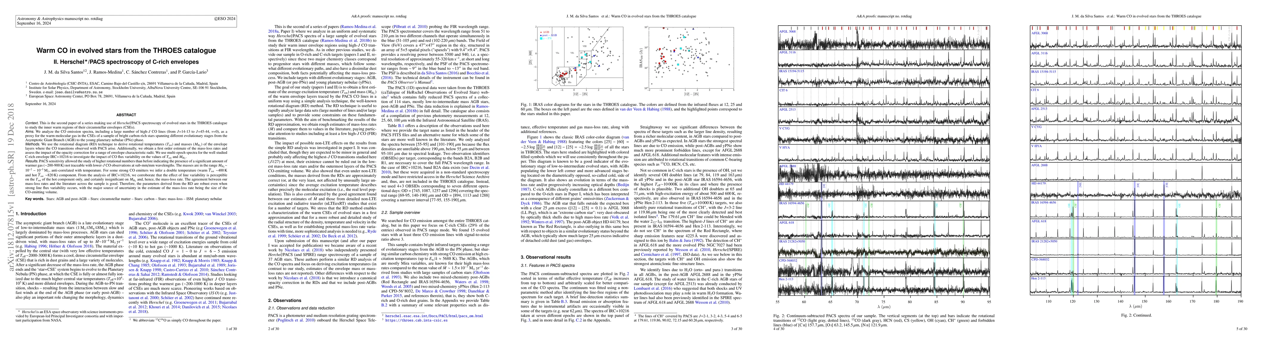 This is the second paper of a series making use of Herschel/PACS spectroscopy of evolved stars in the THROES catalogue to study the inner regions of their circumstellar envelopes (CSEs). We analyze the CO emission spectra, including a large number of high-$J$ CO lines (from $J$=14-13 to $J$=45-44), as a proxy for the warm molecular gas in the CSEs of a sample of bright carbon-rich stars spanning different evolutionary stages from the Asymptotic Giant Branch (AGB) to the young planetary nebulae (PNe) phase. We use the rotational diagram (RD) to derive rotational temperatures ($T_{\rm rot}$) and masses ($M_{\rm H_2}$) of the envelope layers where the CO transitions arise. We also obtain a first order estimate of the mass-loss rates and assess the impact of the opacity correction for a range of characteristic envelope radii. We use multi-epoch spectra for the well studied C-rich envelope IRC+10216 to investigate the impact of CO flux variability on the values of $T_{\rm rot}$ and $M_{\rm H_2}$. PACS sensitivity allowed the study of higher rotational numbers than before, indicating the presence of a significant amount of warmer gas ($\sim$200-900 K) not traceable with lower-$J$ CO observations at sub-mm/mm wavelengths. The masses are in the range $\sim10^{-2}-10^{-5}\,\rm M_{\odot}$, anti-correlated with temperature. For some strong CO emitters we infer a double temperature (warm $T_{\rm rot}\sim$400 K and hot $T_{\rm rot}\sim$820 K) component. From the analysis of IRC+10216, we corroborate that the effect of line variability is perceptible on the $T_{\rm rot}$ of the hot component only, and certainly insignificant on $M_{\rm H_2}$ and, hence, the mass-loss rate. Therefore, the parameters derived from the RD are robust even when strong line flux variability occurs, with the major source of uncertainty in the estimate of the mass-loss rate being the size of the CO-emitting volume.