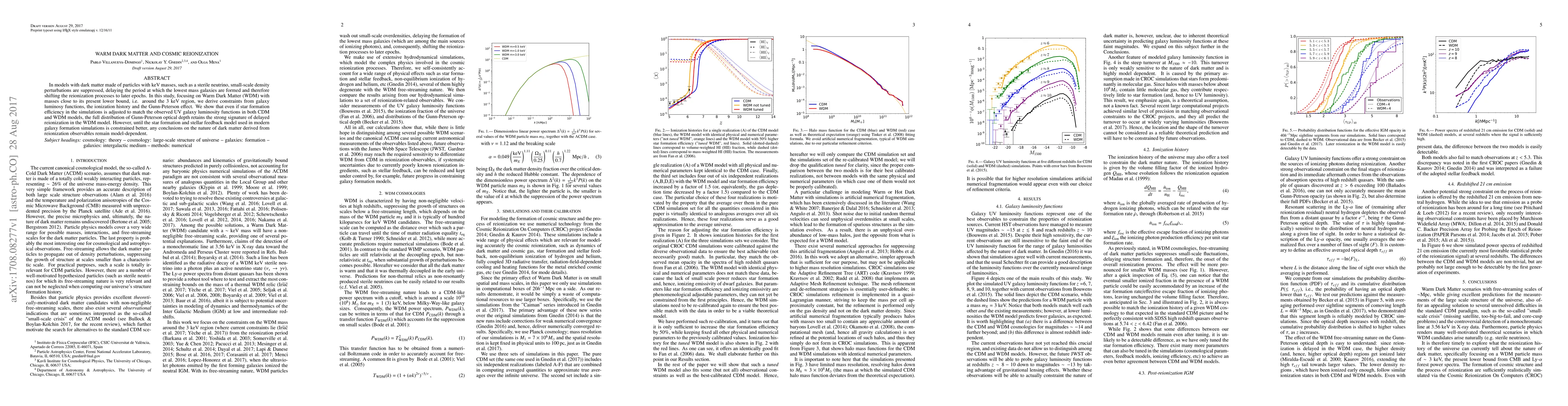 This study investigates the impact of Warm Dark Matter (WDM) with keV masses on cosmic reionization, finding that it delays galaxy formation and shifts reionization to later epochs. Despite adjustments to star formation efficiency, the Gunn-Peterson optical depth retains a signature of delayed reionization in WDM models, but better constraints on star formation and stellar feedback are needed for definitive conclusions on dark matter.