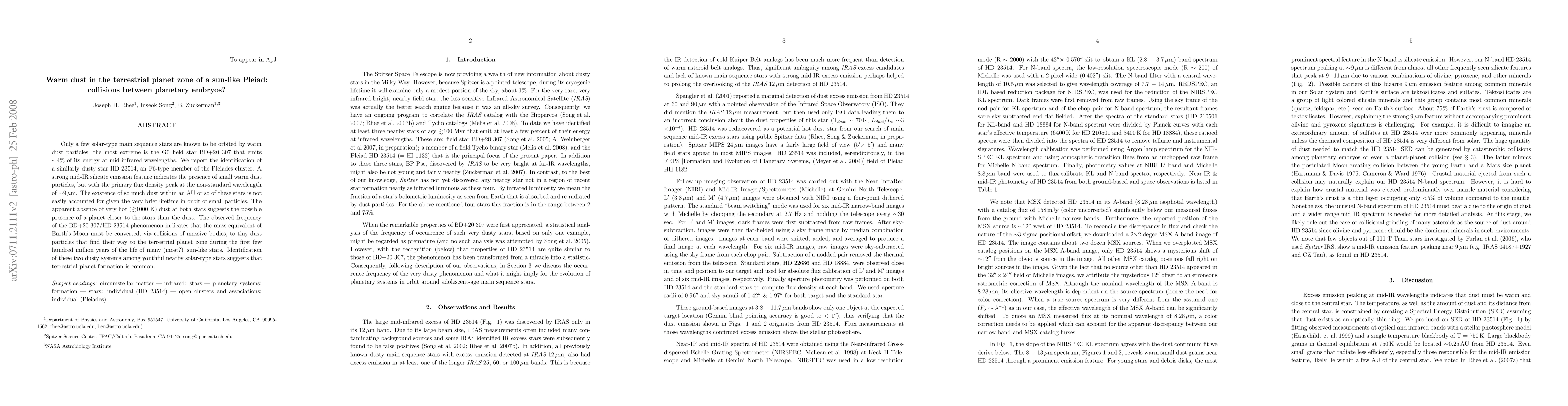 Only a few solar-type main sequence stars are known to be orbited by warm dust particles; the most extreme is the G0 field star BD+20 307 that emits ~4% of its energy at mid-infrared wavelengths. We report the identification of a similarly dusty star HD 23514, an F6-type member of the Pleiades cluster. A strong mid-IR silicate emission feature indicates the presence of small warm dust particles, but with the primary flux density peak at the non-standard wavelength of ~9 micron. The existence of so much dust within an AU or so of these stars is not easily accounted for given the very brief lifetime in orbit of small particles. The apparent absence of very hot (>~1000 K) dust at both stars suggests the possible presence of a planet closer to the stars than the dust. The observed frequency of the BD+20 307/HD 23514 phenomenon indicates that the mass equivalent of Earth's Moon must be converted, via collisions of massive bodies, to tiny dust particles that find their way to the terrestrial planet zone during the first few hundred million years of the life of many (most?) sun-like stars. Identification of these two dusty systems among youthful nearby solar-type stars suggests that terrestrial planet formation is common.