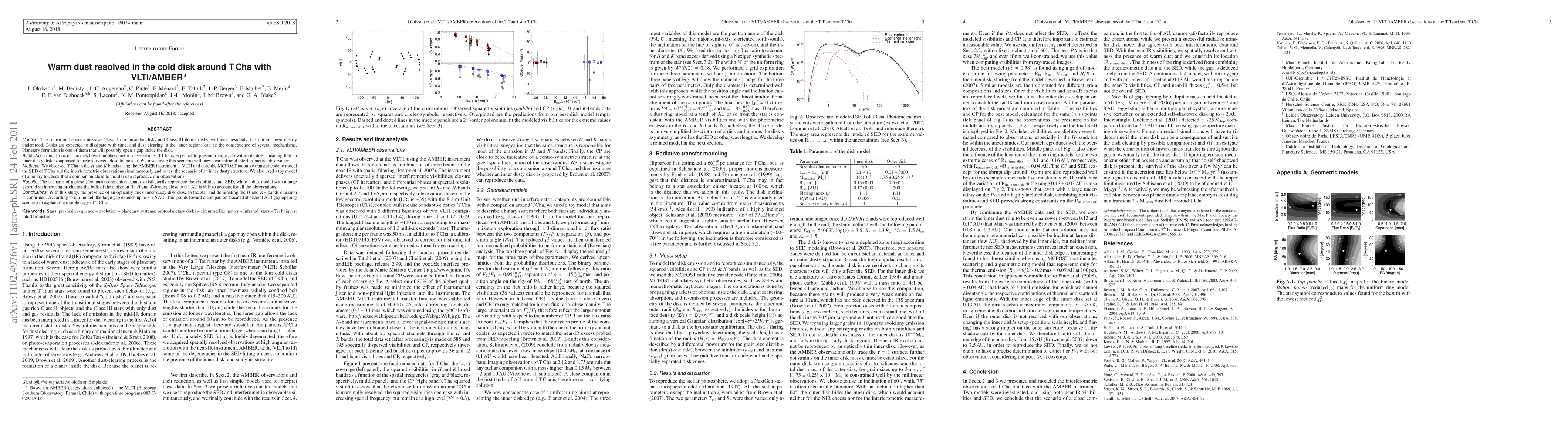 The transition between massive Class II circumstellar disks and Class III debris disks, with dust residuals, has not yet been clearly understood. Disks are expected to dissipate with time, and dust clearing in the inner regions can be the consequence of several mechanisms. Planetary formation is one of them that will possibly open a gap inside the disk. According to recent models based on photometric observations, T Cha is expected to present a large gap within its disk, meaning that an inner dusty disk is supposed to have survived close to the star. We investigate this scenario with new near-infrared interferometric observations. We observed T Cha in the H and K bands using the AMBER instrument at VLTI and used the MCFOST radiative transfer code to model the SED of T Cha and the interferometric observations simultaneously and to test the scenario of an inner dusty structure. We also used a toy model of a binary to check that a companion close to the star can reproduce our observations. The scenario of a close (few mas) companion cannot satisfactorily reproduce the visibilities and SED, while a disk model with a large gap and an inner ring producing the bulk of the emission (in H and K-bands) close to 0.1 AU is able to account for all the observations. With this study, the presence of an optically thick inner dusty disk close to the star and dominating the H and K- bands emission is confirmed. According to our model, the large gap extends up to ~ 7.5 AU. This points toward a companion (located at several AU) gap-opening scenario to explain the morphology of T Cha.